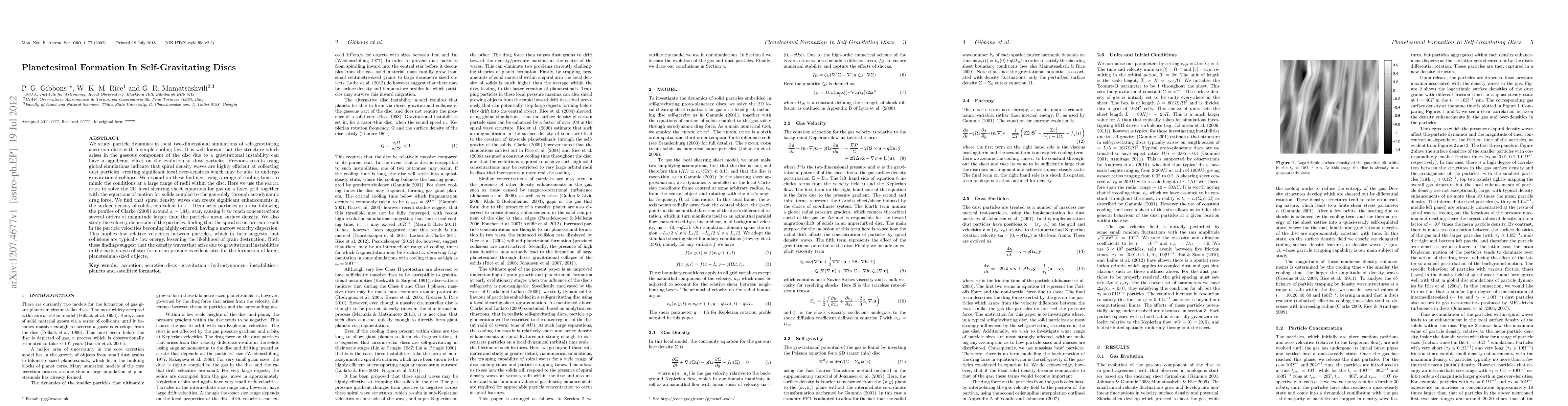 Research finds that spiral density waves in self-gravitating discs can create significant enhancements in surface density of solids, forming large planetesimal-sized objects with low-energy collisions.