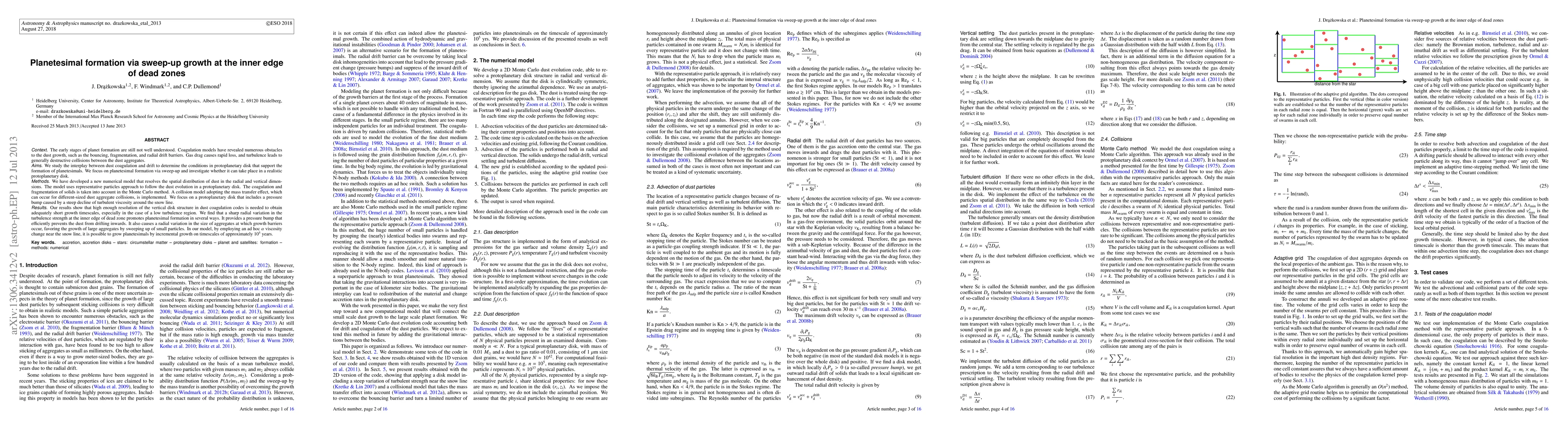 This paper investigates the formation of planetesimals via sweep-up growth at the inner edge of dead zones in protoplanetary disks, using a new numerical model to simulate dust coagulation and fragmentation. The study finds that a pressure bump caused by a steep decline in turbulent viscosity near the snow line promotes efficient planetesimal formation by preventing inward dust drift and favoring the growth of large aggregates.