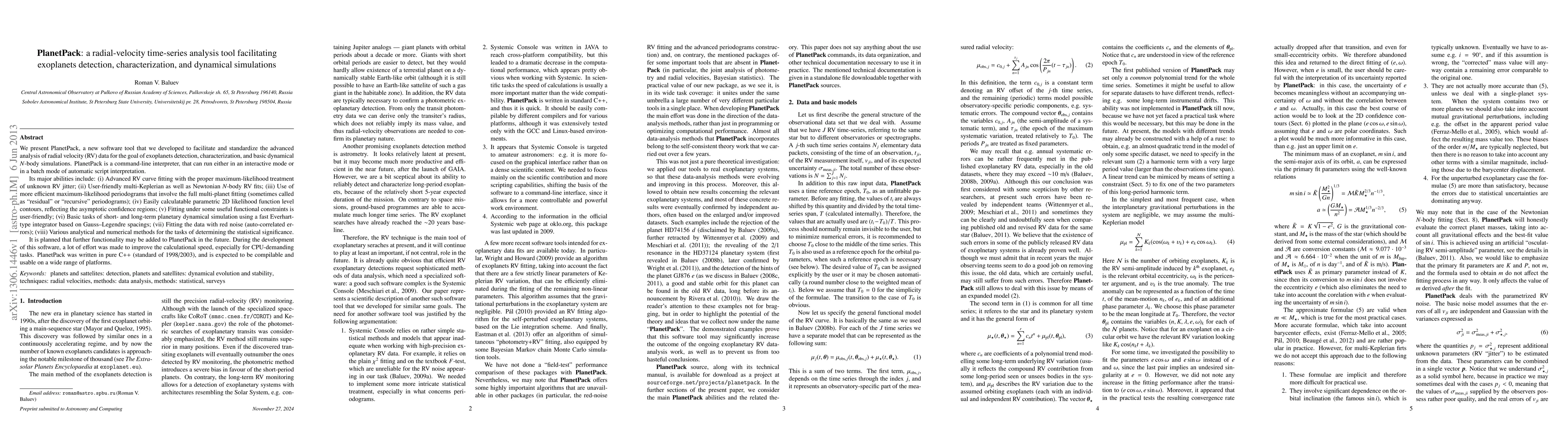 We present PlanetPack, a new software tool that we developed to facilitate and standardize the advanced analysis of radial velocity (RV) data for the goal of exoplanets detection, characterization, and basic dynamical $N$-body simulations. PlanetPack is a command-line interpreter, that can run either in an interactive mode or in a batch mode of automatic script interpretation. Its major abilities include: (i) Advanced RV curve fitting with the proper maximum-likelihood treatment of unknown RV jitter; (ii) User-friendly multi-Keplerian as well as Newtonian $N$-body RV fits; (iii) Use of more efficient maximum-likelihood periodograms that involve the full multi-planet fitting (sometimes called as ``residual'' or ``recursive'' periodograms); (iv) Easily calculatable parametric 2D likelihood function level contours, reflecting the asymptotic confidence regions; (v) Fitting under some useful functional constraints is user-friendly; (vi) Basic tasks of short- and long-term planetary dynamical simulation using a fast Everhart-type integrator based on Gauss--Legendre spacings; (vii) Fitting the data with red noise (auto-correlated errors); (viii) Various analytical and numerical methods for the tasks of determining the statistical significance. It is planned that further functionality may be added to PlanetPack in the future. During the development of this software, a lot of effort was made to improve the calculational speed, especially for CPU-demanding tasks. PlanetPack was written in pure C++ (standard of 1998/2003), and is expected to be compilable and usable on a wide range of platforms.