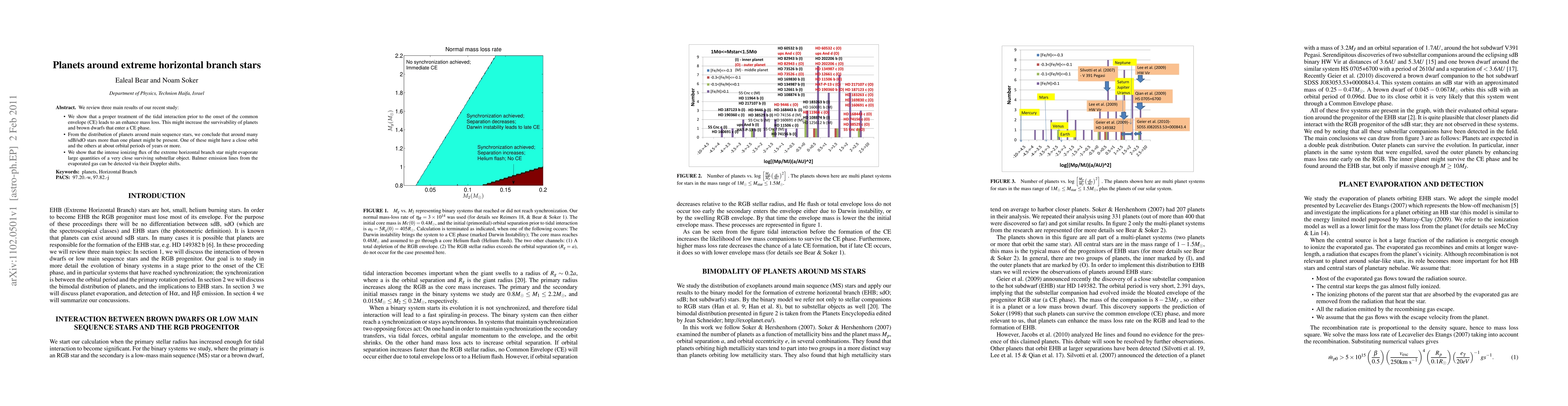 We review three main results of our recent study: We show that a proper treatment of the tidal interaction prior to the onset of the common envelope (CE) leads to an enhance mass loss. This might increase the survivability of planets and brown dwarfs that enter a CE phase. From the distribution of planets around main sequence stars, we conclude that around many sdB/sdO stars more than one planet might be present. One of these might have a close orbit and the others at about orbital periods of years or more. We show that the intense ionizing flux of the extreme horizontal branch star might evaporate large quantities of a very close surviving substellar object. Balmer emission lines from the evaporated gas can be detected via their Doppler shifts.