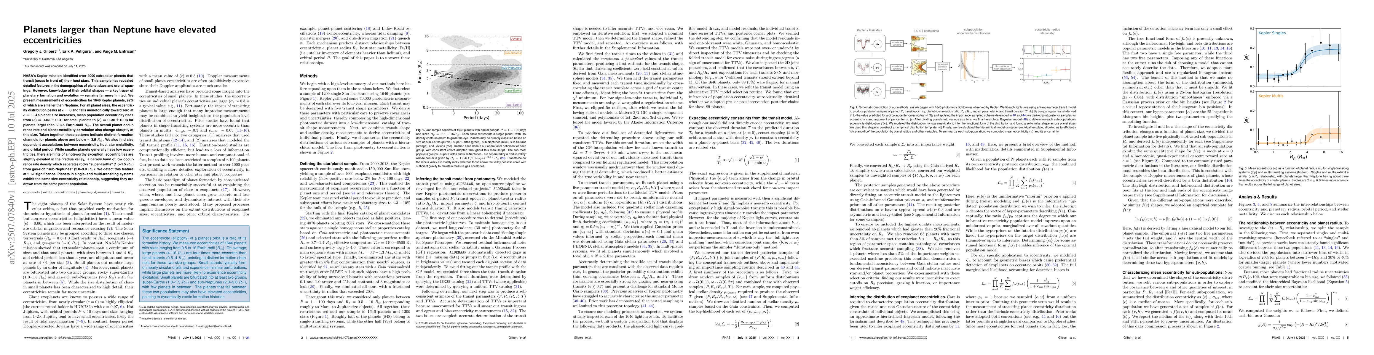 NASA's Kepler mission identified over 4000 extrasolar planets that transit (cross in front of) their host stars. This sample has revealed detailed features in the demographics of planet sizes and orbital spacings. However, knowledge of their orbital shapes - a key tracer of planetary formation and evolution - remains far more limited. We present measurements of eccentricities for 1646 Kepler planets, 92% of which are smaller than Neptune. For all planet sizes, the eccentricity distribution peaks at e=0 and falls monotonically toward zero at e=1. As planet size increases, mean population eccentricity rises from $\langle e \rangle = 0.05 \pm 0.01$ for small planets to $\langle e \rangle = 0.20 \pm 0.03$ for planets larger than $\sim$ 3.5 Earth-radii. The overall planet occurrence rate and planet-metallicity correlation also change abruptly at this size. Taken together, these patterns indicate distinct formation channels for planets above and below $\sim$ 3.5 Earth-radii. We also find size dependent associations between eccentricity, host star metallicity, and orbital period. While smaller planets generally have low eccentricities, there are hints of a noteworthy exception: eccentricities are slightly elevated in the ``radius valley,'' a narrow band of low occurrence rate density which separates rocky ``super-Earths'' (1.0-1.5 Earth-radii) from gas-rich ``sub-Neptunes'' (2.0-3.0 Earth-radii. We detect this feature at $2.1\sigma$ significance. Planets in single- and multi-transiting systems exhibit the same size-eccentricity relationship, suggesting they are drawn from the same parent population.