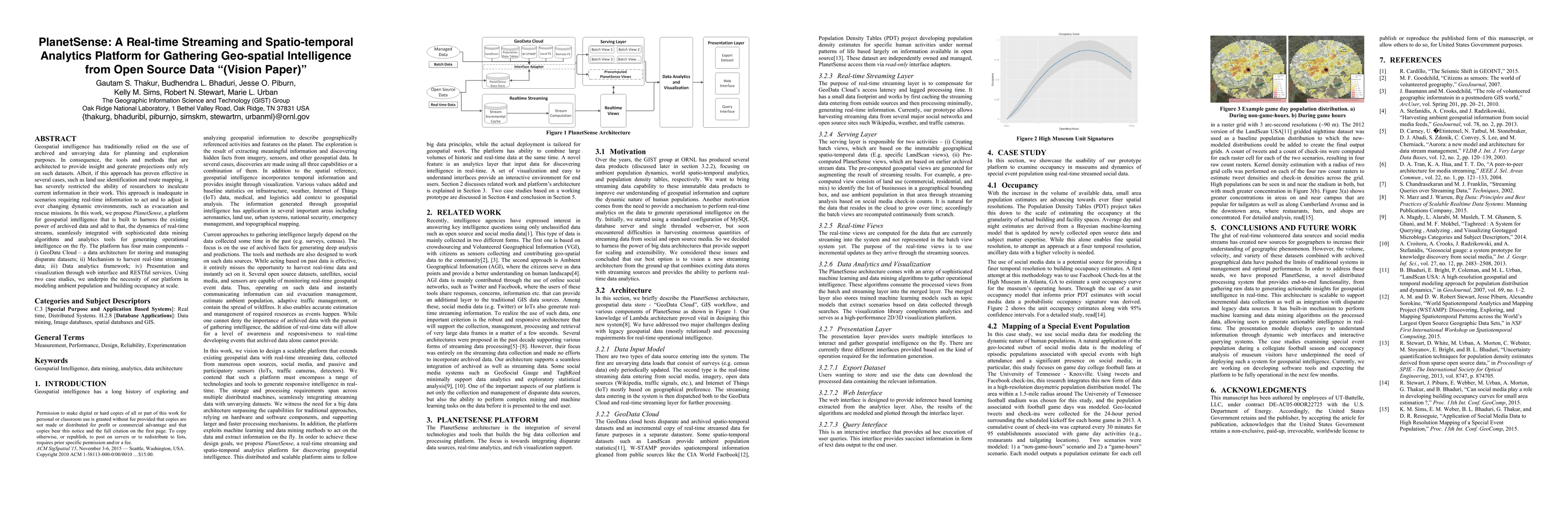 Geospatial intelligence has traditionally relied on the use of archived and unvarying data for planning and exploration purposes. In consequence, the tools and methods that are architected to provide insight and generate projections only rely on such datasets. Albeit, if this approach has proven effective in several cases, such as land use identification and route mapping, it has severely restricted the ability of researchers to inculcate current information in their work. This approach is inadequate in scenarios requiring real-time information to act and to adjust in ever changing dynamic environments, such as evacuation and rescue missions. In this work, we propose PlanetSense, a platform for geospatial intelligence that is built to harness the existing power of archived data and add to that, the dynamics of real-time streams, seamlessly integrated with sophisticated data mining algorithms and analytics tools for generating operational intelligence on the fly. The platform has four main components - i. GeoData Cloud - a data architecture for storing and managing disparate datasets; ii. Mechanism to harvest real-time streaming data; iii. Data analytics framework; iv. Presentation and visualization through web interface and RESTful services. Using two case studies, we underpin the necessity of our platform in modeling ambient population and building occupancy at scale.