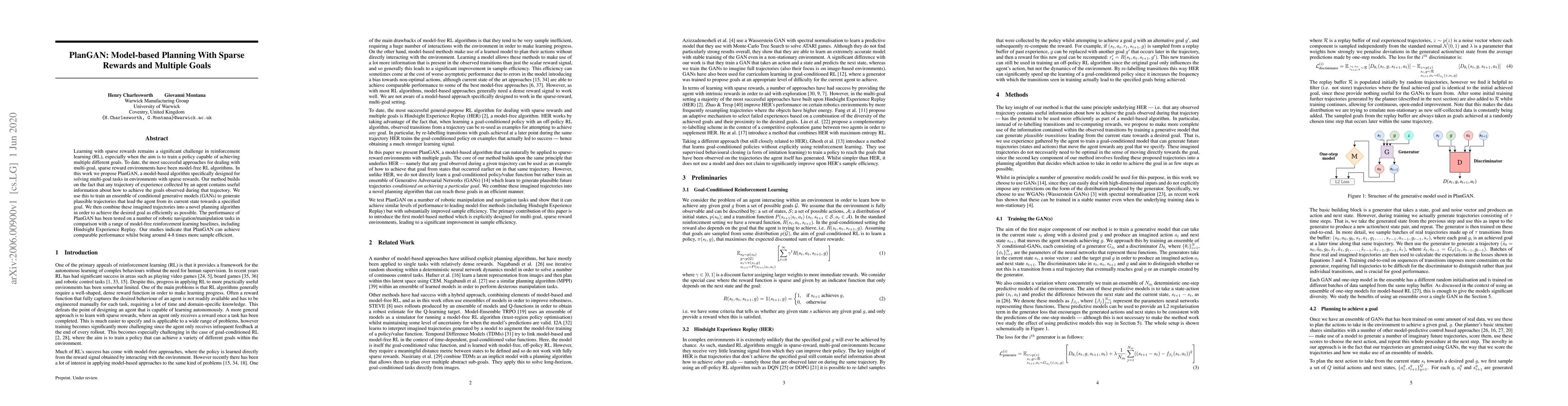 PlanGAN is a model-based reinforcement learning algorithm designed to solve multi-goal tasks in environments with sparse rewards. It uses generative adversarial networks (GANs) to create plausible trajectories towards goals, combining them into a planning algorithm for efficient goal achievement.