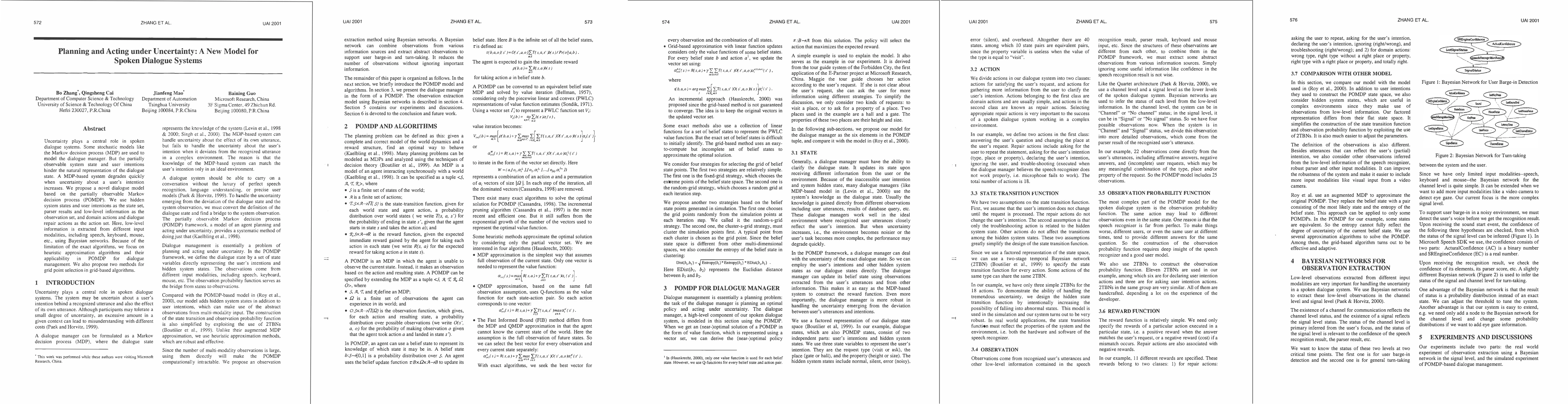 Uncertainty plays a central role in spoken dialogue systems. Some stochastic models like Markov decision process (MDP) are used to model the dialogue manager. But the partially observable system state and user intention hinder the natural representation of the dialogue state. MDP-based system degrades fast when uncertainty about a user's intention increases. We propose a novel dialogue model based on the partially observable Markov decision process (POMDP). We use hidden system states and user intentions as the state set, parser results and low-level information as the observation set, domain actions and dialogue repair actions as the action set. Here the low-level information is extracted from different input modals, including speech, keyboard, mouse, etc., using Bayesian networks. Because of the limitation of the exact algorithms, we focus on heuristic approximation algorithms and their applicability in POMDP for dialogue management. We also propose two methods for grid point selection in grid-based approximation algorithms.