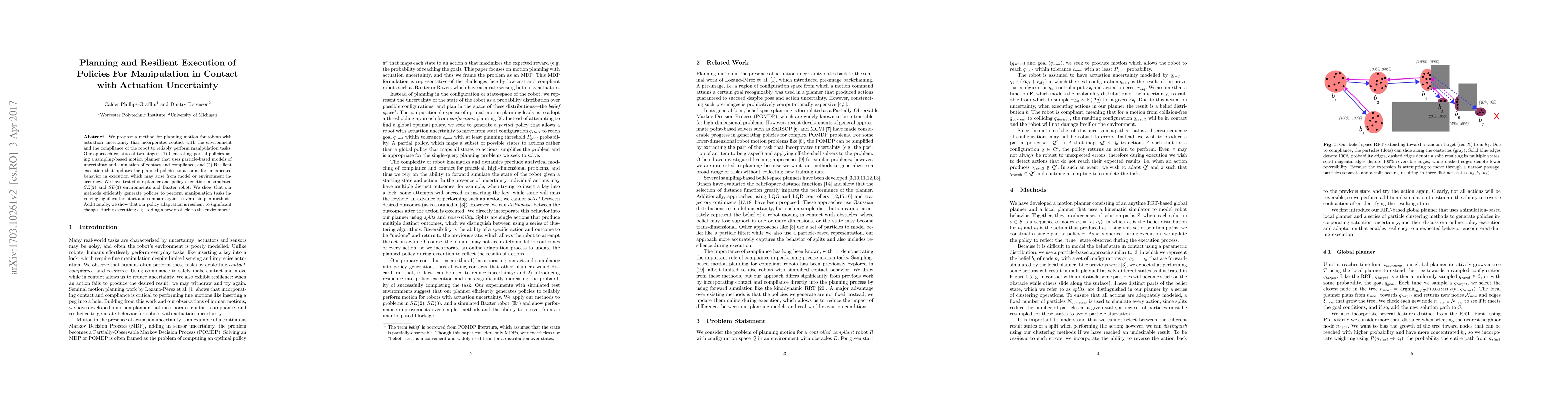 This paper presents a method for planning and executing manipulation tasks for robots under actuation uncertainty, focusing on contact interactions. It uses a two-stage approach: generating adaptive partial policies via a sampling-based planner and resilient execution that updates policies in response to unexpected changes during task execution.
