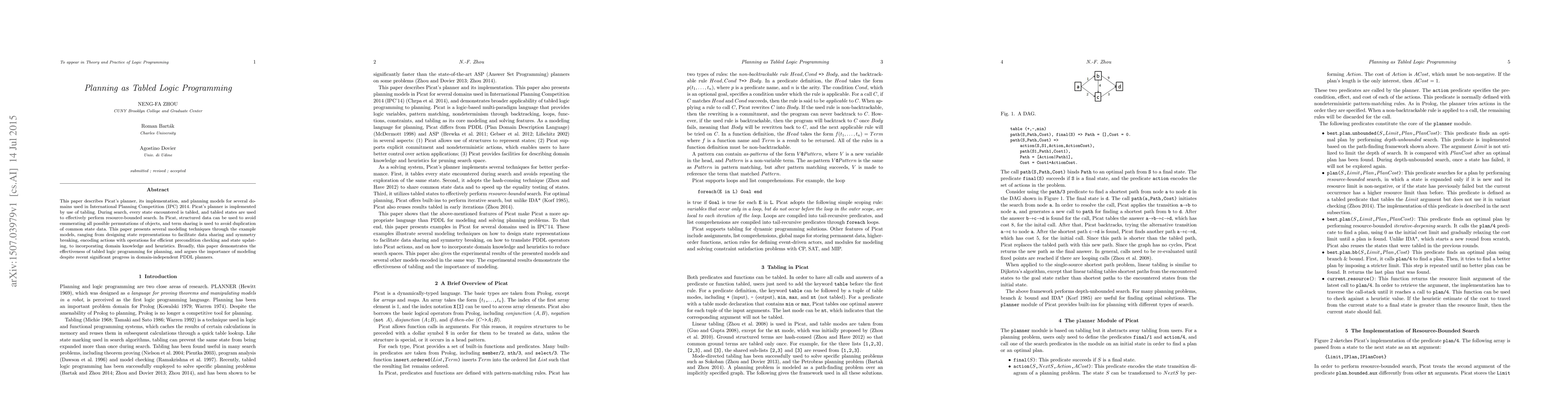 This paper introduces Picat's planner, implemented using tabling to efficiently perform resource-bounded search, and presents modeling techniques for various domains in the IPC 2014. It emphasizes the importance of effective state representations and domain knowledge in enhancing planning performance.