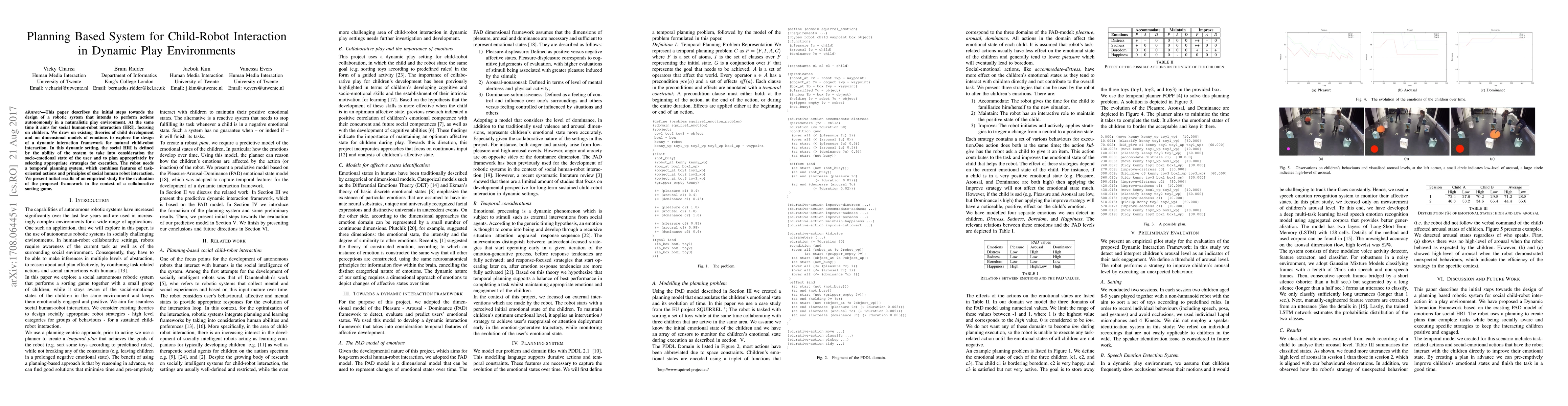 This paper describes the initial steps towards the design of a robotic system that intends to perform actions autonomously in a naturalistic play environment. At the same time it aims for social human-robot interaction~(HRI), focusing on children. We draw on existing theories of child development and on dimensional models of emotions to explore the design of a dynamic interaction framework for natural child-robot interaction. In this dynamic setting, the social HRI is defined by the ability of the system to take into consideration the socio-emotional state of the user and to plan appropriately by selecting appropriate strategies for execution. The robot needs a temporal planning system, which combines features of task-oriented actions and principles of social human robot interaction. We present initial results of an empirical study for the evaluation of the proposed framework in the context of a collaborative sorting game.