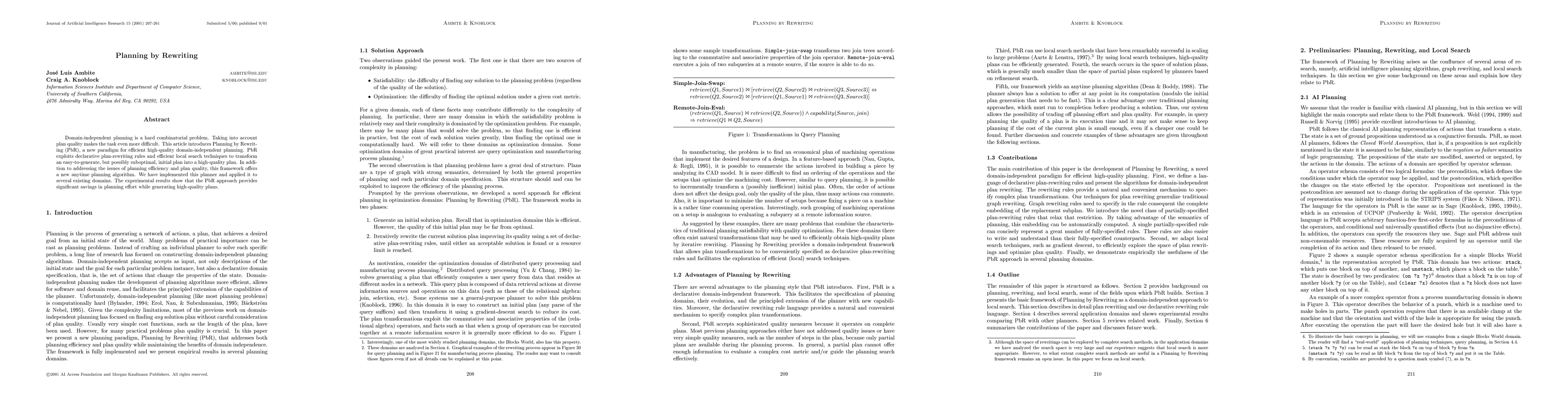 Domain-independent planning is a hard combinatorial problem. Taking into account plan quality makes the task even more difficult. This article introduces Planning by Rewriting (PbR), a new paradigm for efficient high-quality domain-independent planning. PbR exploits declarative plan-rewriting rules and efficient local search techniques to transform an easy-to-generate, but possibly suboptimal, initial plan into a high-quality plan. In addition to addressing the issues of planning efficiency and plan quality, this framework offers a new anytime planning algorithm. We have implemented this planner and applied it to several existing domains. The experimental results show that the PbR approach provides significant savings in planning effort while generating high-quality plans.