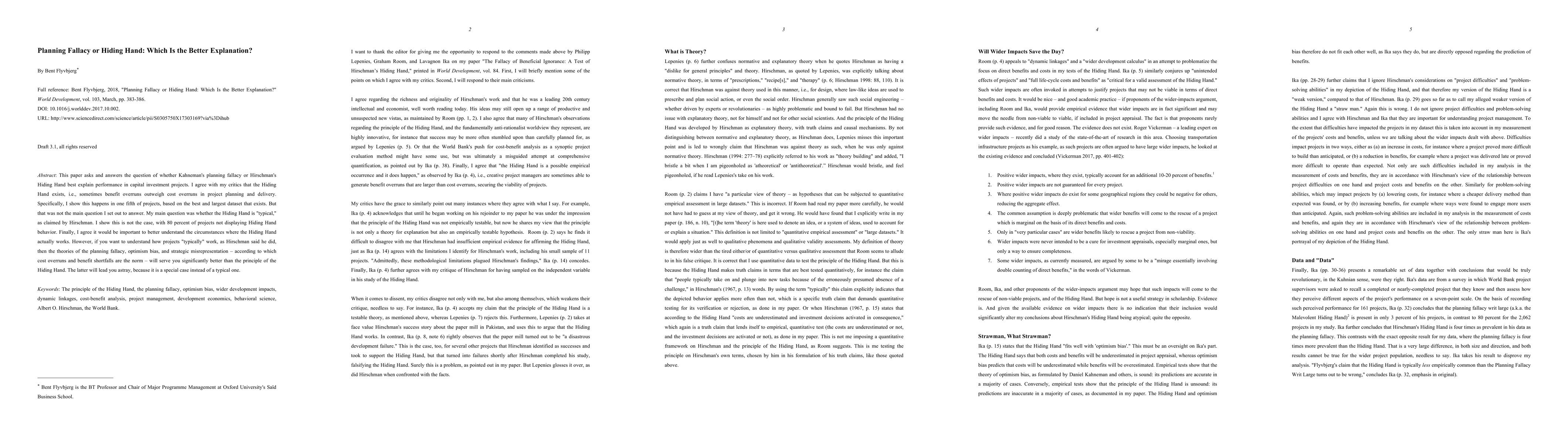 This paper evaluates whether Kahneman's planning fallacy or Hirschman's Hiding Hand better explains performance in capital investment projects. It finds that while the Hiding Hand occurs in 20% of projects, it is not typical, with 80% of projects showing cost overruns and benefit shortfalls, supporting the planning fallacy theory.