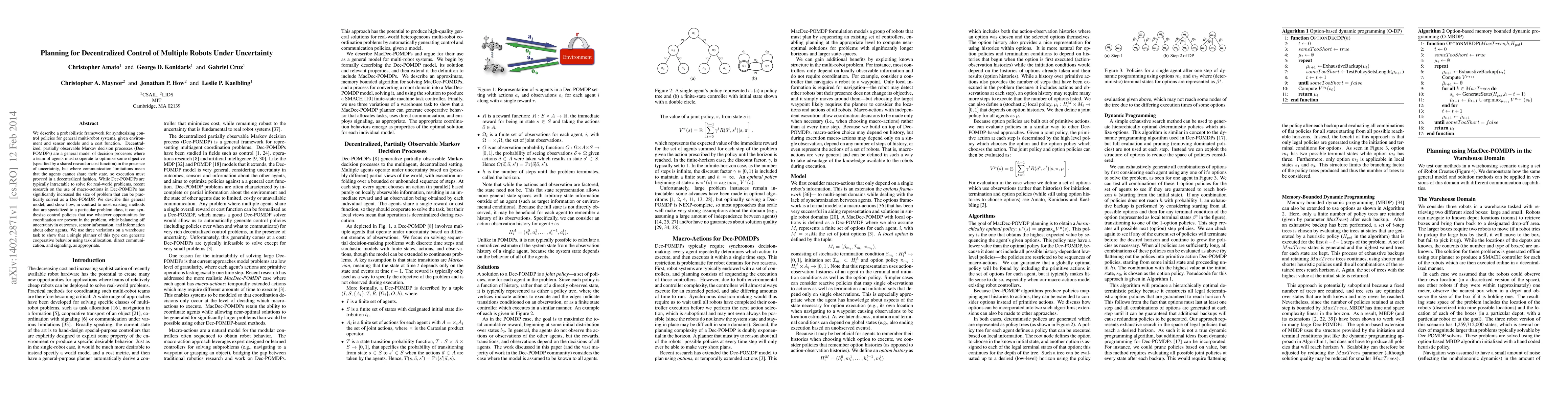 We describe a probabilistic framework for synthesizing control policies for general multi-robot systems, given environment and sensor models and a cost function. Decentralized, partially observable Markov decision processes (Dec-POMDPs) are a general model of decision processes where a team of agents must cooperate to optimize some objective (specified by a shared reward or cost function) in the presence of uncertainty, but where communication limitations mean that the agents cannot share their state, so execution must proceed in a decentralized fashion. While Dec-POMDPs are typically intractable to solve for real-world problems, recent research on the use of macro-actions in Dec-POMDPs has significantly increased the size of problem that can be practically solved as a Dec-POMDP. We describe this general model, and show how, in contrast to most existing methods that are specialized to a particular problem class, it can synthesize control policies that use whatever opportunities for coordination are present in the problem, while balancing off uncertainty in outcomes, sensor information, and information about other agents. We use three variations on a warehouse task to show that a single planner of this type can generate cooperative behavior using task allocation, direct communication, and signaling, as appropriate.