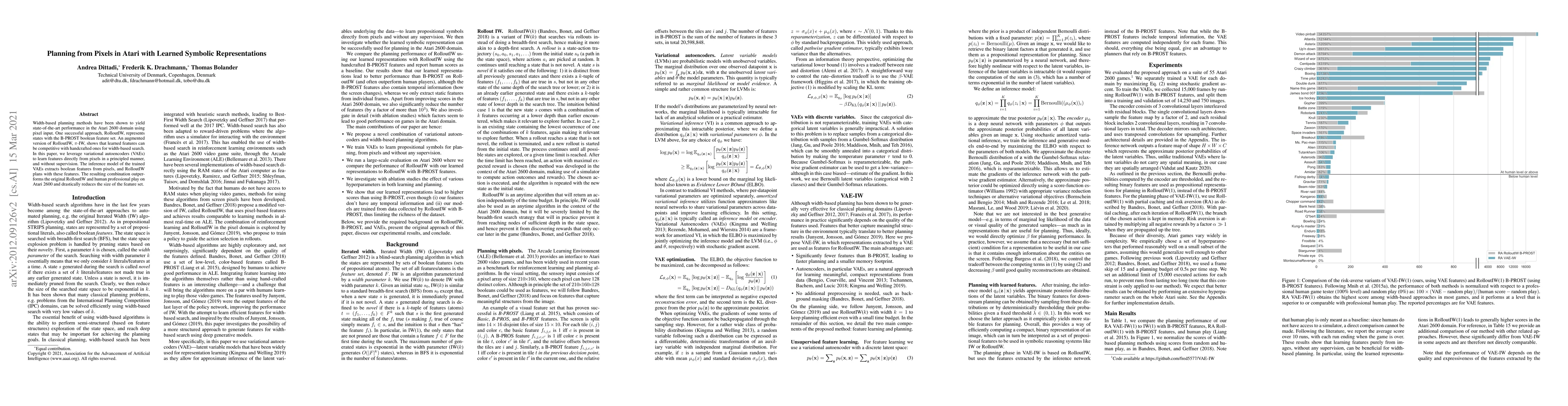 This paper explores using variational autoencoders to learn symbolic representations directly from Atari game pixels, which are then used in width-based planning methods like RolloutIW. The learned features outperform handcrafted ones and significantly reduce the feature set size while achieving performance comparable to human play.