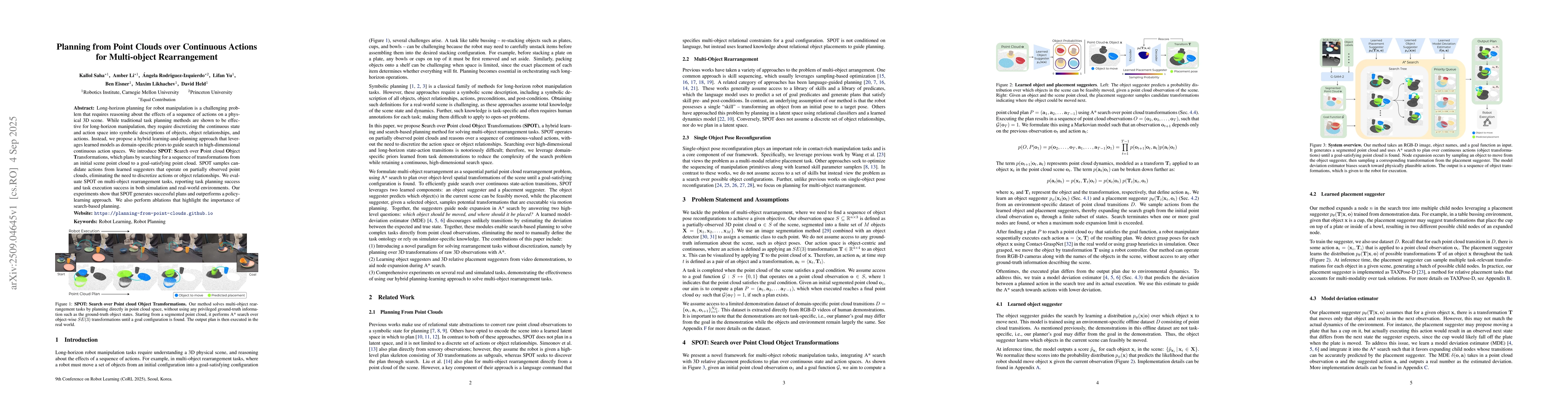 Long-horizon planning for robot manipulation is a challenging problem that requires reasoning about the effects of a sequence of actions on a physical 3D scene. While traditional task planning methods are shown to be effective for long-horizon manipulation, they require discretizing the continuous state and action space into symbolic descriptions of objects, object relationships, and actions. Instead, we propose a hybrid learning-and-planning approach that leverages learned models as domain-specific priors to guide search in high-dimensional continuous action spaces. We introduce SPOT: Search over Point cloud Object Transformations, which plans by searching for a sequence of transformations from an initial scene point cloud to a goal-satisfying point cloud. SPOT samples candidate actions from learned suggesters that operate on partially observed point clouds, eliminating the need to discretize actions or object relationships. We evaluate SPOT on multi-object rearrangement tasks, reporting task planning success and task execution success in both simulation and real-world environments. Our experiments show that SPOT generates successful plans and outperforms a policy-learning approach. We also perform ablations that highlight the importance of search-based planning.