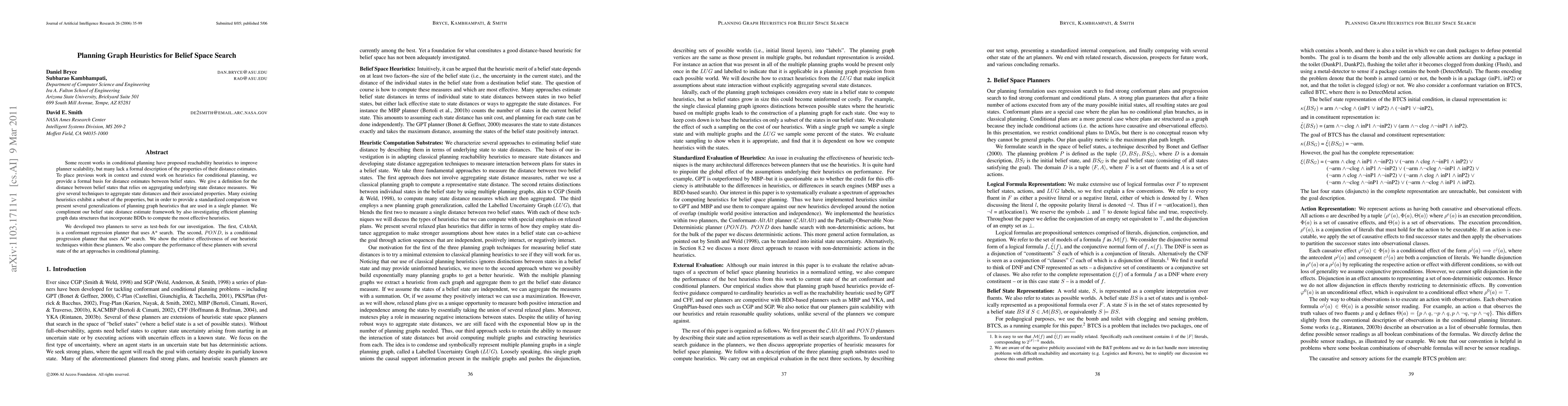 Some recent works in conditional planning have proposed reachability heuristics to improve planner scalability, but many lack a formal description of the properties of their distance estimates. To place previous work in context and extend work on heuristics for conditional planning, we provide a formal basis for distance estimates between belief states. We give a definition for the distance between belief states that relies on aggregating underlying state distance measures. We give several techniques to aggregate state distances and their associated properties. Many existing heuristics exhibit a subset of the properties, but in order to provide a standardized comparison we present several generalizations of planning graph heuristics that are used in a single planner. We compliment our belief state distance estimate framework by also investigating efficient planning graph data structures that incorporate BDDs to compute the most effective heuristics. We developed two planners to serve as test-beds for our investigation. The first, CAltAlt, is a conformant regression planner that uses A* search. The second, POND, is a conditional progression planner that uses AO* search. We show the relative effectiveness of our heuristic techniques within these planners. We also compare the performance of these planners with several state of the art approaches in conditional planning.