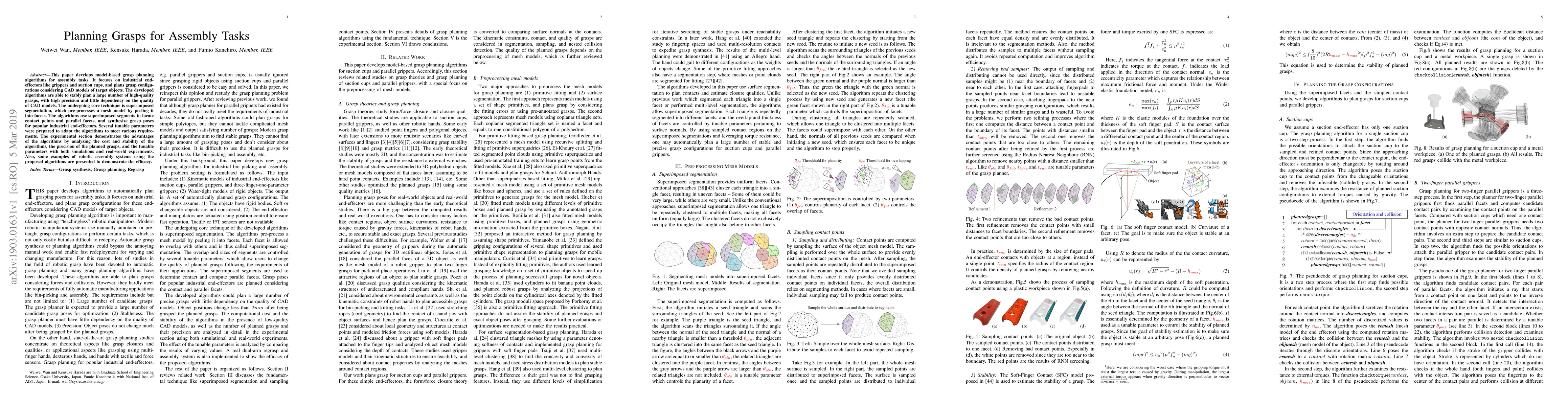 This paper develops model-based grasp planning algorithms for assembly tasks. It focuses on industrial end-effectors like grippers and suction cups, and plans grasp configurations considering CAD models of target objects. The developed algorithms are able to stably plan a large number of high-quality grasps, with high precision and little dependency on the quality of CAD models. The undergoing core technique is superimposed segmentation, which pre-processes a mesh model by peeling it into facets. The algorithms use superimposed segments to locate contact points and parallel facets, and synthesize grasp poses for popular industrial end-effectors. Several tunable parameters were prepared to adapt the algorithms to meet various requirements. The experimental section demonstrates the advantages of the algorithms by analyzing the cost and stability of the algorithms, the precision of the planned grasps, and the tunable parameters with both simulations and real-world experiments. Also, some examples of robotic assembly systems using the proposed algorithms are presented to demonstrate the efficacy.