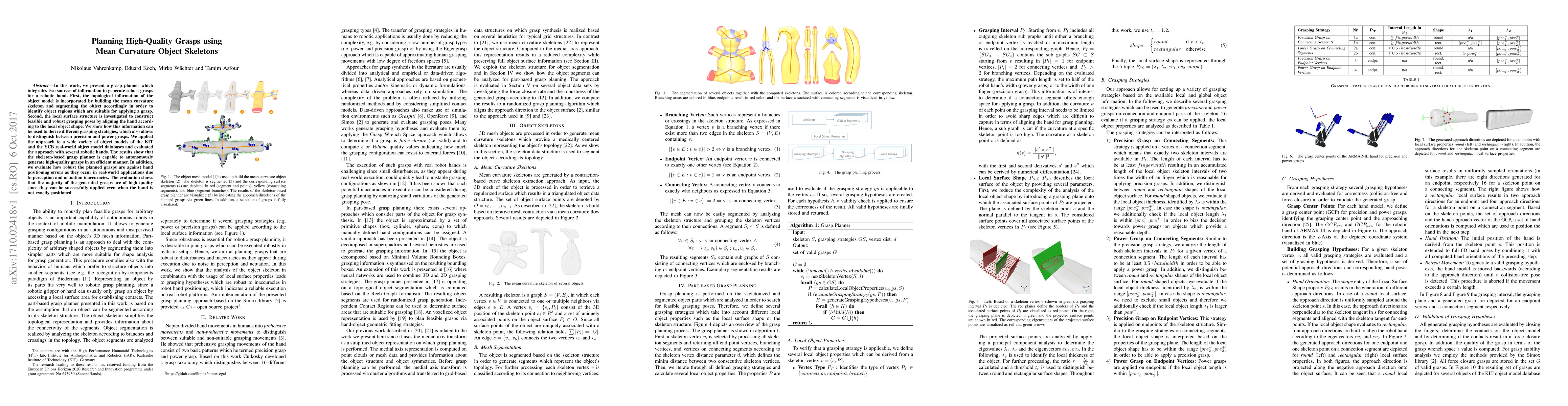 A grasp planner generates high-quality grasps for a robotic hand using object skeletons and local surface structure analysis, achieving robust and efficient grasping poses even with hand positioning errors.
