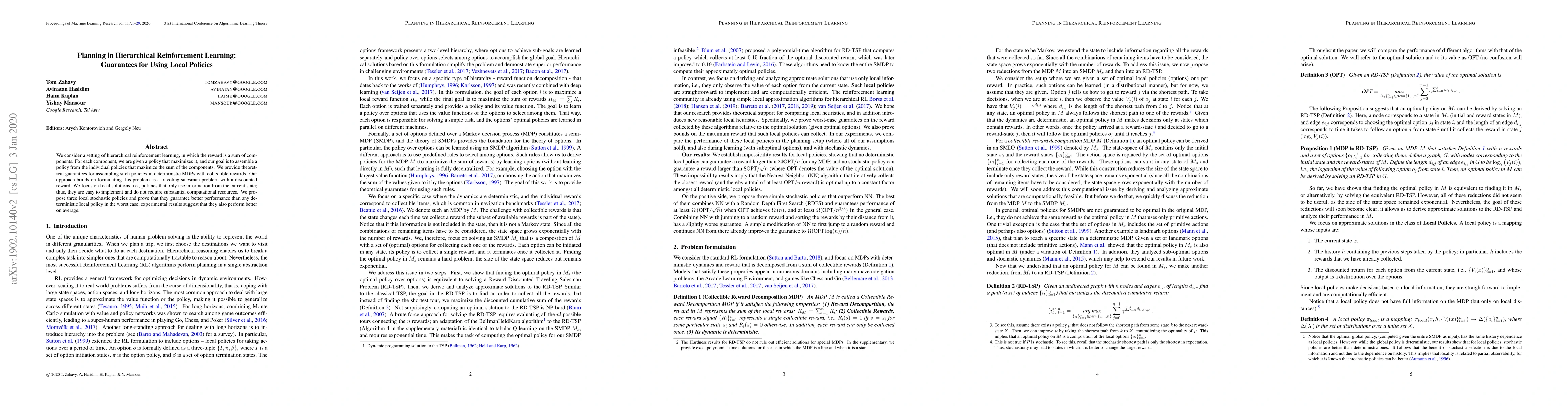We consider a settings of hierarchical reinforcement learning, in which the reward is a sum of components. For each component we are given a policy that maximizes it and our goal is to assemble a policy from the individual policies that maximizes the sum of the components. We provide theoretical guarantees for assembling such policies in deterministic MDPs with collectible rewards. Our approach builds on formulating this problem as a traveling salesman problem with discounted reward. We focus on local solutions, i.e., policies that only use information from the current state; thus, they are easy to implement and do not require substantial computational resources. We propose three local stochastic policies and prove that they guarantee better performance than any deterministic local policy in the worst case; experimental results suggest that they also perform better on average.