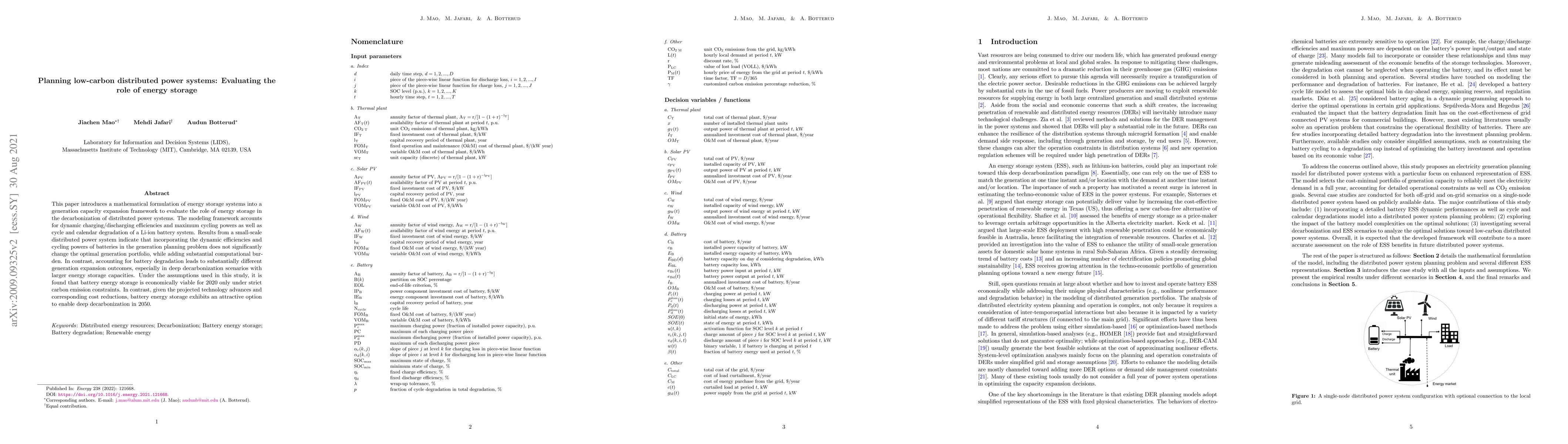This paper evaluates the role of energy storage in low-carbon distributed power systems, finding that while dynamic efficiencies and cycling powers have minimal impact, battery degradation significantly alters generation planning, especially under stringent decarbonization goals. By 2050, battery energy storage is projected to become economically viable due to technological advancements.