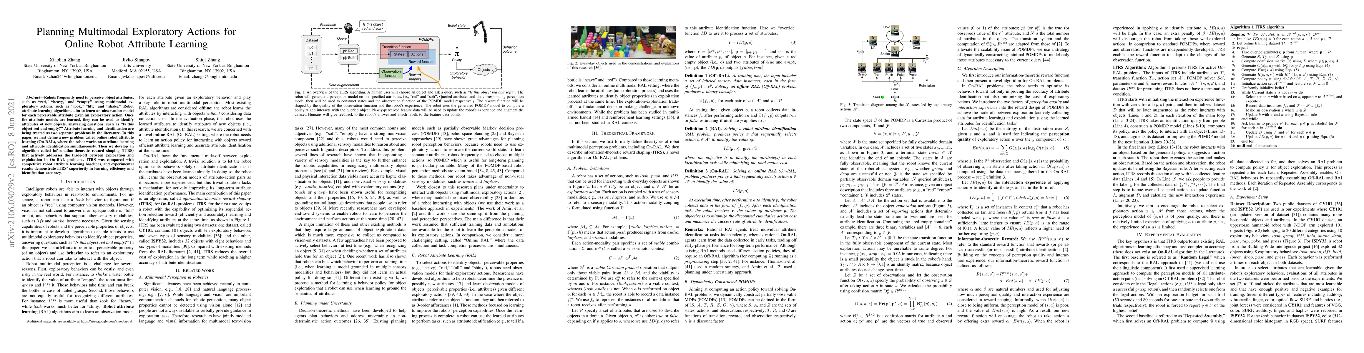 This paper introduces online robot attribute learning (On-RAL), where robots learn and identify object attributes simultaneously. It proposes an information-theoretic reward shaping (ITRS) algorithm that optimizes the balance between exploration and exploitation, outperforming existing baselines in learning efficiency and identification accuracy.