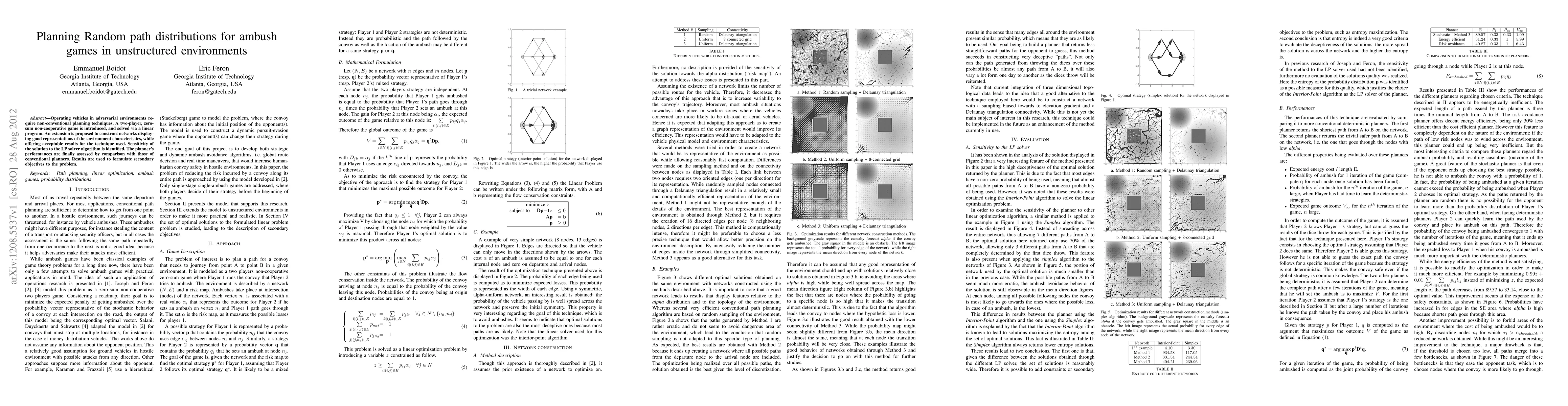 Operating vehicles in adversarial environments require non-conventional planning techniques. A two-player, zero-sum non-cooperative game is introduced, which is solved via a linear program. An extension is proposed to construct networks displaying good representations of the environment characteristics, while offering acceptable results for the technique used. Sensitivity of the solution to the LP solver algorithm is identified. The performances of the planner are finally assessed by comparison with those of conventional planners. Results are used to formulate secondary objectives to the problem.
