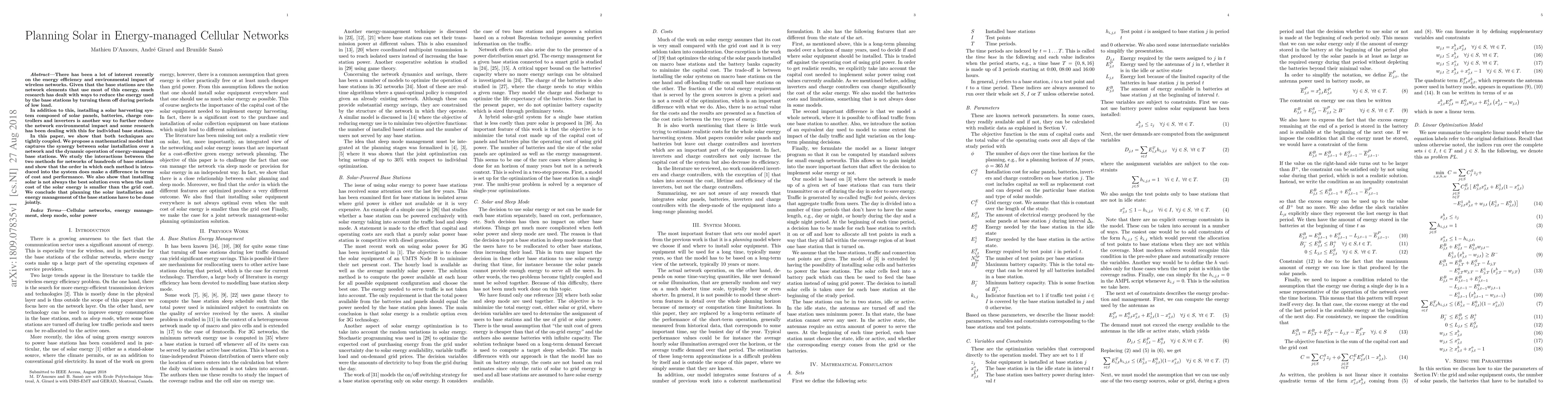 Researchers propose a mathematical model to optimize energy management and solar installation in cellular networks, finding that joint planning is crucial for cost and performance.