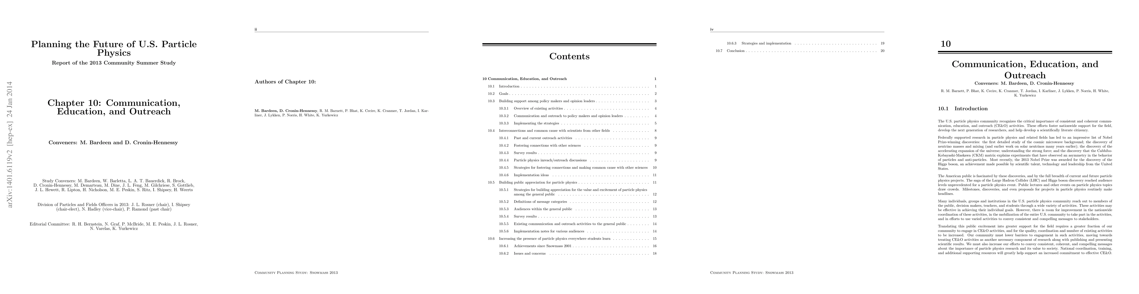 This chapter from the Snowmass 2013 report outlines strategies for enhancing communication, education, and outreach in U.S. particle physics, focusing on effective dissemination of information to educators, scientists, policymakers, and the public. It emphasizes the importance of public engagement and educational initiatives to support the future of particle physics research.