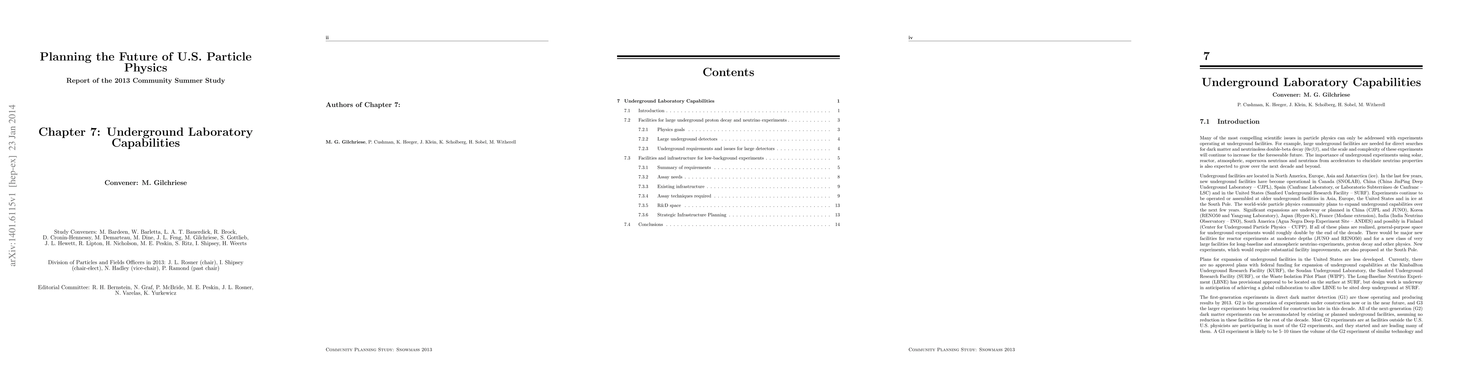 These reports present the results of the 2013 Community Summer Study of the APS Division of Particles and Fields ("Snowmass 2013") on the future program of particle physics in the U.S. Chapter 7, on Underground Laboratory Capabilities, discusses the prospects and requirements for large underground experiments such as those for neutrino physics, proton decay, and dark matter.