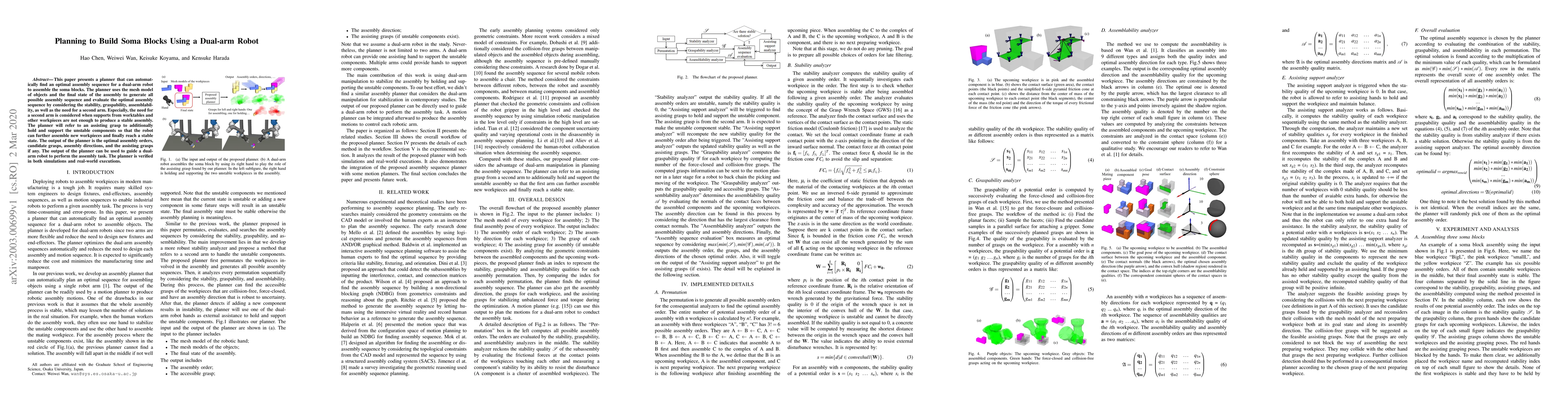 This paper presents a planner that can automatically find an optimal assembly sequence for a dual-arm robot to assemble the soma blocks. The planner uses the mesh model of objects and the final state of the assembly to generate all possible assembly sequence and evaluate the optimal assembly sequence by considering the stability, graspability, assemblability, as well as the need for a second arm. Especially, the need for a second arm is considered when supports from worktables and other workpieces are not enough to produce a stable assembly. The planner will refer to an assisting grasp to additionally hold and support the unstable components so that the robot can further assemble new workpieces and finally reach a stable state. The output of the planner is the optimal assembly orders, candidate grasps, assembly directions, and the assisting grasps if any. The output of the planner can be used to guide a dual-arm robot to perform the assembly task. The planner is verified in both simulations and real-world executions.