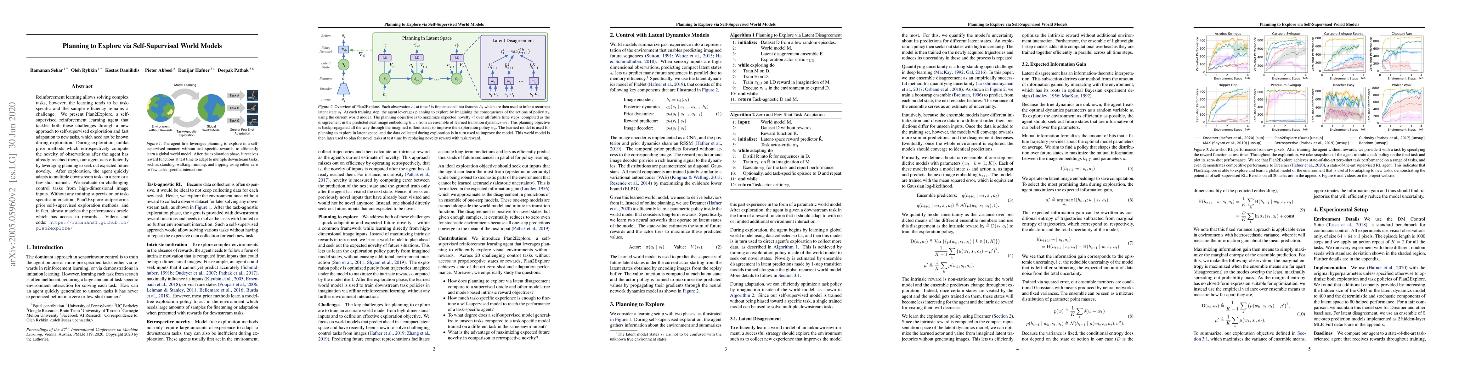 Reinforcement learning allows solving complex tasks, however, the learning tends to be task-specific and the sample efficiency remains a challenge. We present Plan2Explore, a self-supervised reinforcement learning agent that tackles both these challenges through a new approach to self-supervised exploration and fast adaptation to new tasks, which need not be known during exploration. During exploration, unlike prior methods which retrospectively compute the novelty of observations after the agent has already reached them, our agent acts efficiently by leveraging planning to seek out expected future novelty. After exploration, the agent quickly adapts to multiple downstream tasks in a zero or a few-shot manner. We evaluate on challenging control tasks from high-dimensional image inputs. Without any training supervision or task-specific interaction, Plan2Explore outperforms prior self-supervised exploration methods, and in fact, almost matches the performances oracle which has access to rewards. Videos and code at https://ramanans1.github.io/plan2explore/