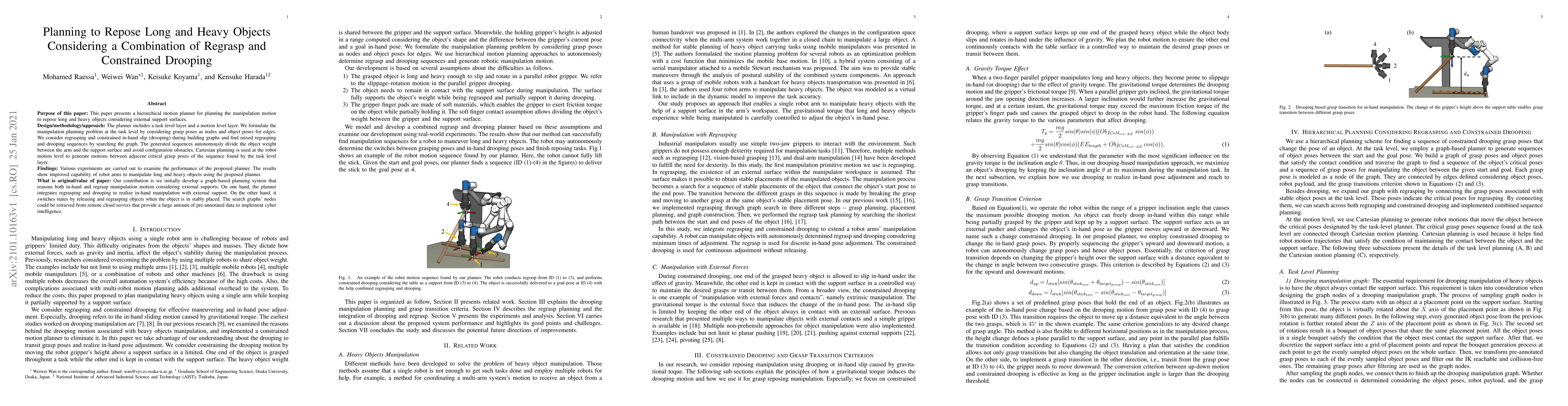 This paper introduces a hierarchical motion planner that combines regrasping and constrained drooping for manipulating long and heavy objects, utilizing external support surfaces. The planner uses graph-based task and motion levels to autonomously balance object weight between the robot arm and support, avoiding configuration obstacles.