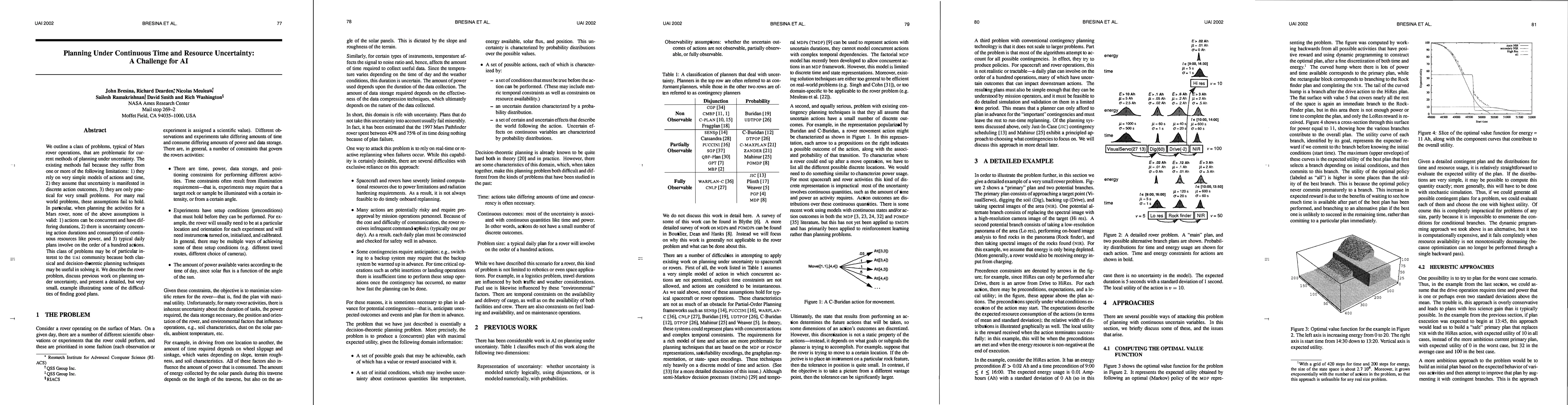This paper identifies challenges in AI planning under continuous time and resource uncertainty, particularly relevant for Mars rover operations. Existing methods are limited by simplistic action and time models, discrete uncertainty, and small problem scalability, none of which apply to rover tasks involving concurrent actions, uncertain durations, and continuous resource consumption like power, with daily plans comprising hundreds of actions.