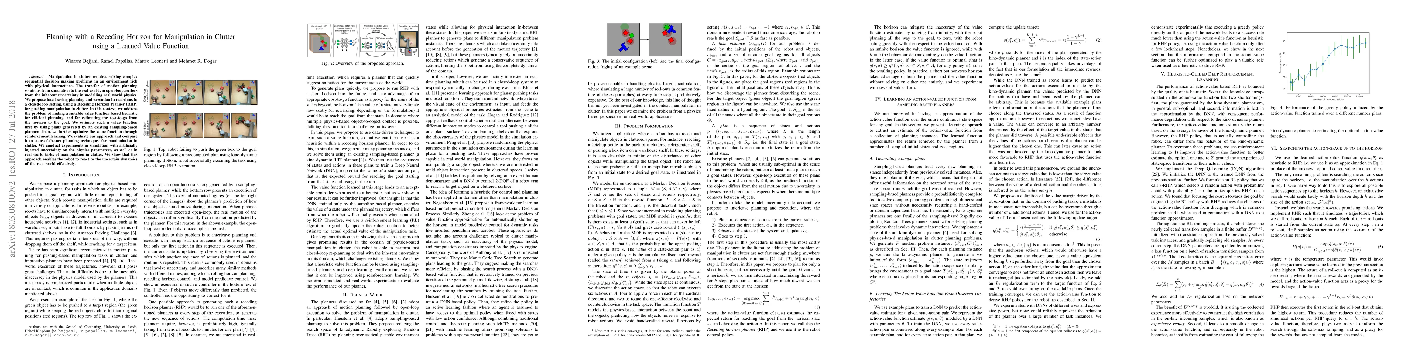This paper proposes a Receding Horizon Planner (RHP) for manipulation in cluttered environments, interleaving real-time planning and execution to adapt to real-world uncertainties. It optimizes a learned value function through reinforcement learning to improve planning efficiency and cost-to-go estimation, demonstrating effectiveness in both simulated and real-world cluttered manipulation tasks.