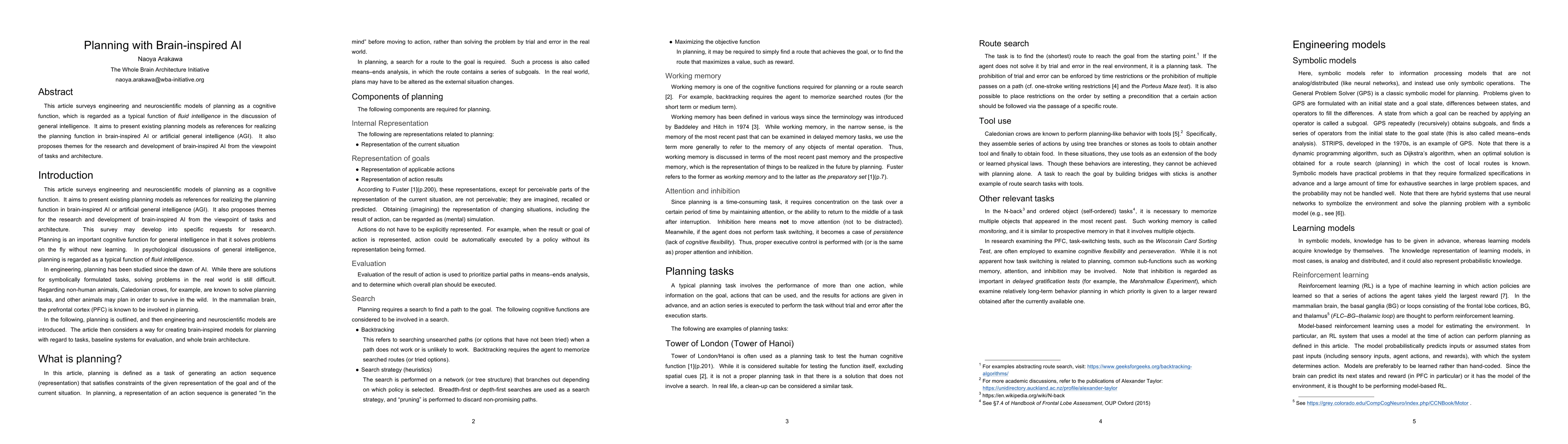 This article surveys engineering and neuroscientific models of planning as a cognitive function, which is regarded as a typical function of fluid intelligence in the discussion of general intelligence. It aims to present existing planning models as references for realizing the planning function in brain-inspired AI or artificial general intelligence (AGI). It also proposes themes for the research and development of brain-inspired AI from the viewpoint of tasks and architecture.