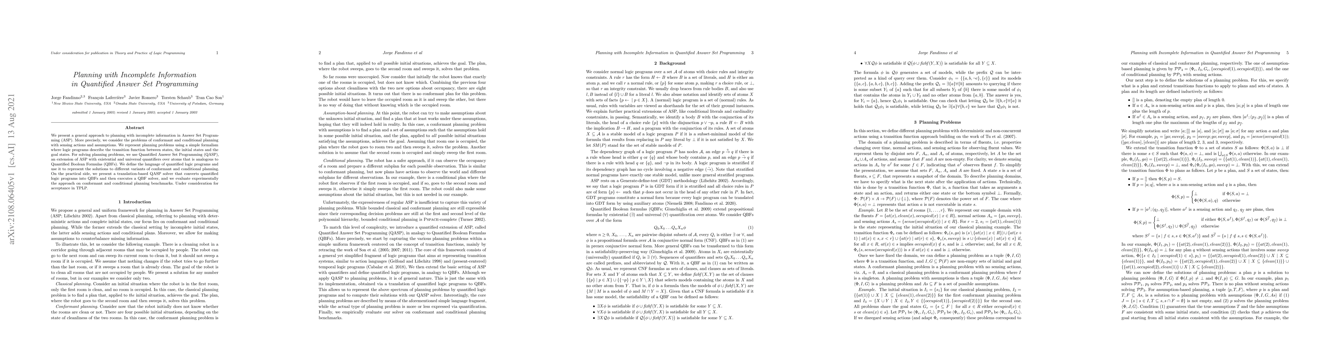 This paper proposes a method for planning with incomplete information using Quantified Answer Set Programming (QASP). It introduces a formalism for representing conformant and conditional planning problems and employs a translation-based QASP solver that converts quantified logic programs into Quantified Boolean Formulas (QBFs) for solving. Experimental evaluations on planning benchmarks are presented.
