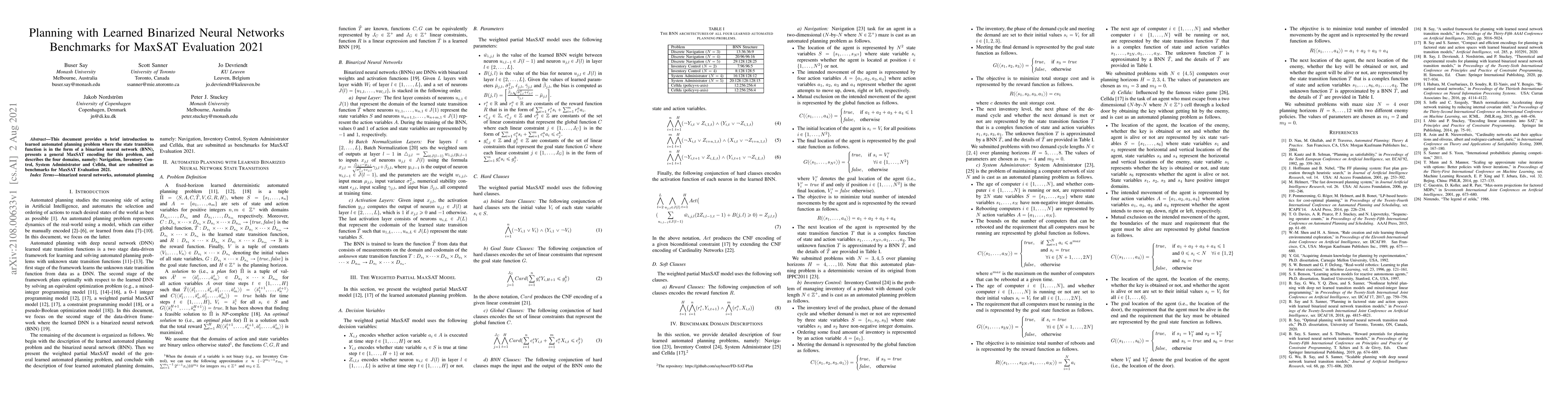 This document provides a brief introduction to learned automated planning problem where the state transition function is in the form of a binarized neural network (BNN), presents a general MaxSAT encoding for this problem, and describes the four domains, namely: Navigation, Inventory Control, System Administrator and Cellda, that are submitted as benchmarks for MaxSAT Evaluation 2021.