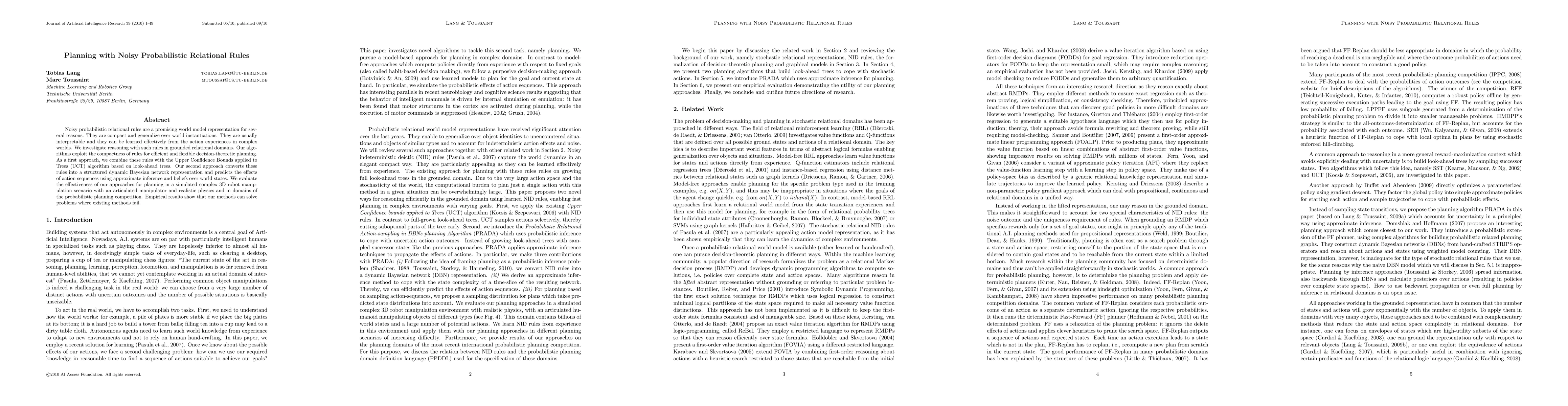 This paper explores the use of noisy probabilistic relational rules for efficient decision-theoretic planning in complex environments. It proposes two approaches: combining rules with UCT for look-ahead trees and converting rules into a dynamic Bayesian network for approximate inference, demonstrating effectiveness in 3D robot manipulation and probabilistic planning competitions.