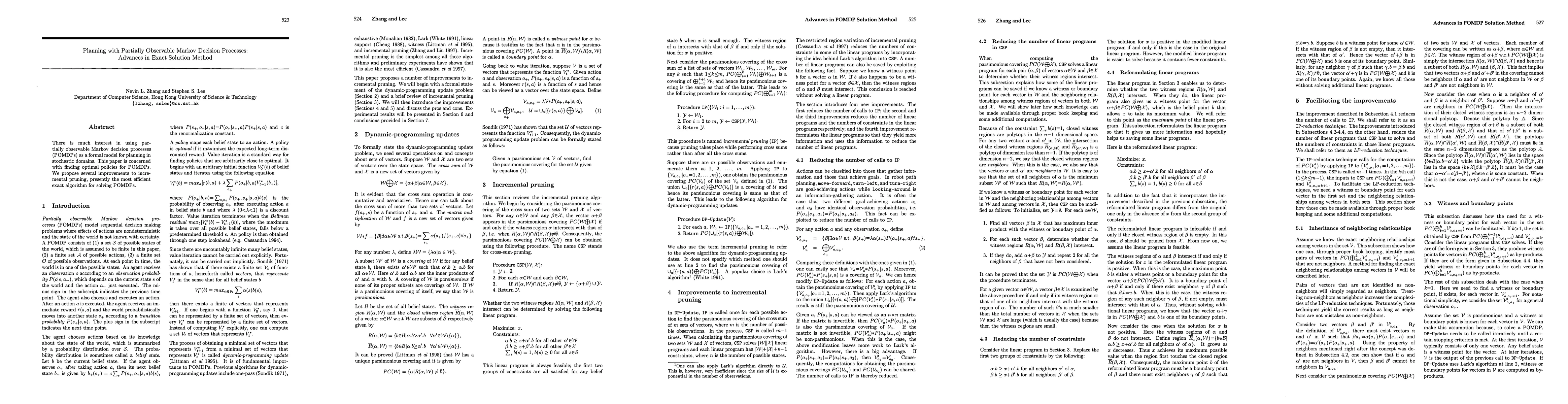 There is much interest in using partially observable Markov decision processes (POMDPs) as a formal model for planning in stochastic domains. This paper is concerned with finding optimal policies for POMDPs. We propose several improvements to incremental pruning, presently the most efficient exact algorithm for solving POMDPs.