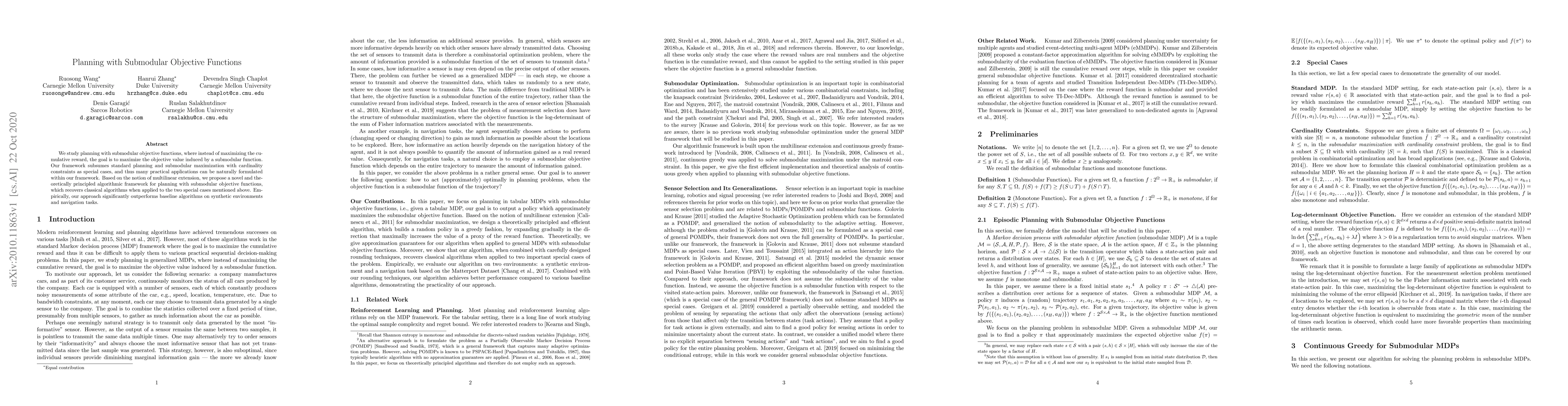 We study planning with submodular objective functions, where instead of maximizing the cumulative reward, the goal is to maximize the objective value induced by a submodular function. Our framework subsumes standard planning and submodular maximization with cardinality constraints as special cases, and thus many practical applications can be naturally formulated within our framework. Based on the notion of multilinear extension, we propose a novel and theoretically principled algorithmic framework for planning with submodular objective functions, which recovers classical algorithms when applied to the two special cases mentioned above. Empirically, our approach significantly outperforms baseline algorithms on synthetic environments and navigation tasks.
