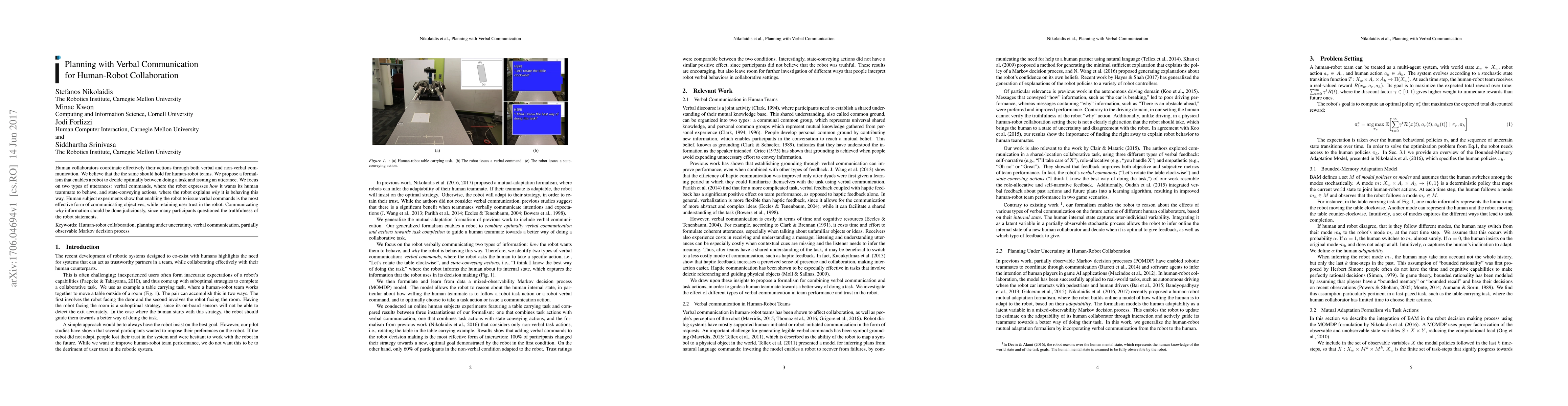 The paper presents a model for human-robot mutual adaptation, integrating verbal communication into decision-making processes using a Markov decision process (MDP) framework with partially observable states.
