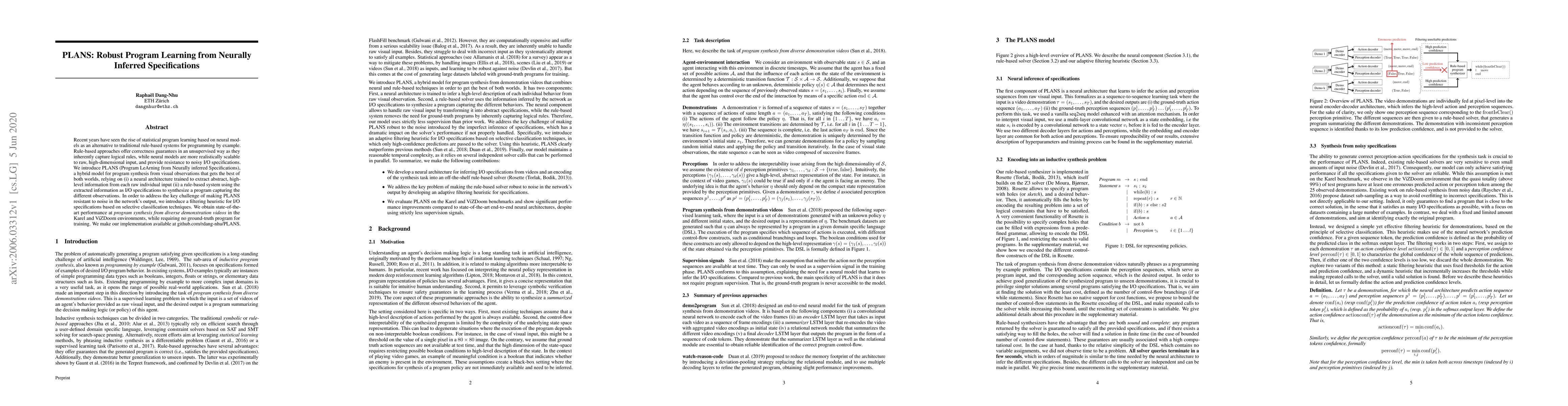 PLANS combines neural models and rule-based systems for robust program synthesis from visual observations, achieving state-of-the-art performance in noisy environments without requiring ground-truth programs. It uses neural extraction of high-level information and a filtering heuristic to address noise.