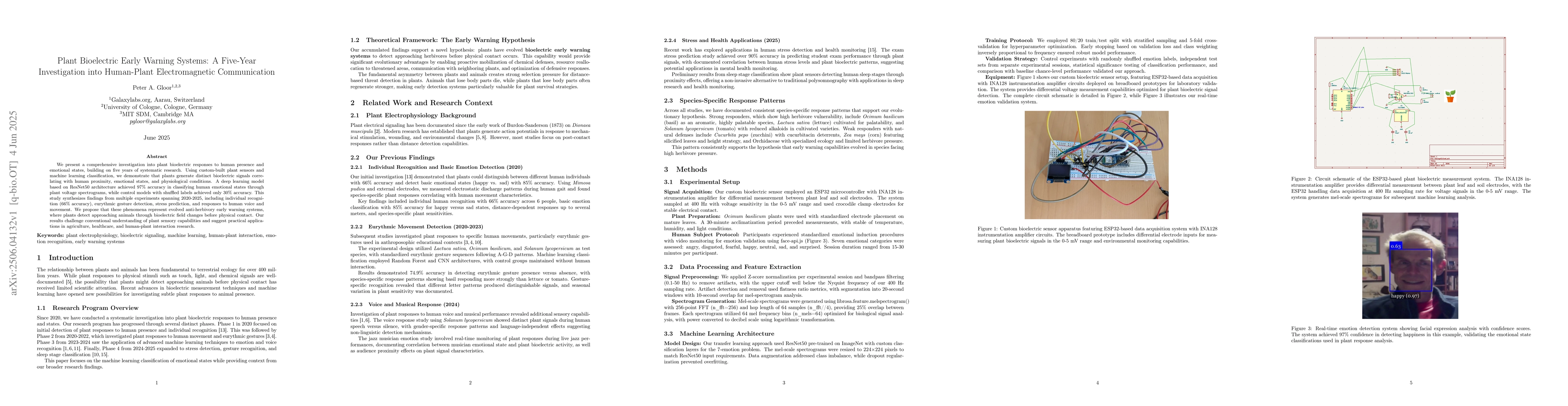 This study reveals that plants generate distinct bioelectric signals in response to human presence and emotional states, with a deep learning model achieving 97% accuracy in classifying human emotions through plant voltage spectrograms.