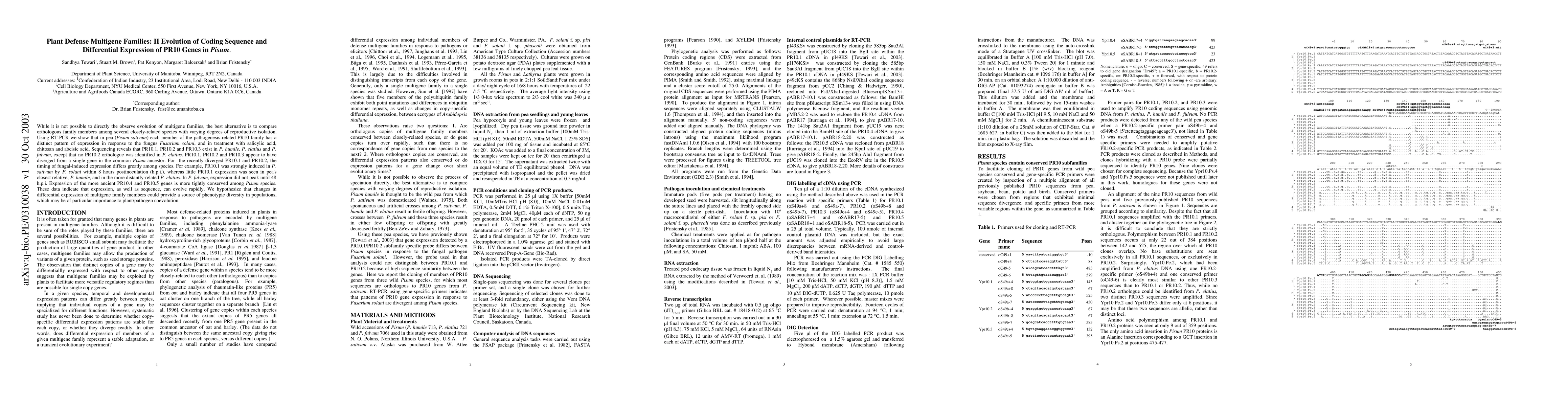 While it is not possible to directly the observe evolution of multigene families, the best alternative is to compare orthologous family members among several closely-related species with varying degrees of reproductive isolation. Using RT-PCR we show that in pea (Pisum sativum) each member of the pathogenesis-related PR10 family has a distinct pattern of expression in response to the fungus Fusarium solani, and in treatment with salicylic acid, chitosan and abcisic acid. Sequencing reveals that PR10.1, PR10.2 and PR10.3 exist in P. humile, P. elatius and P. fulvum, except that no PR10.2 orthologue was identified in P. elatius. PR10.1, PR10.2 and PR10.3 appear to have diverged from a single gene in the common Pisum ancestor. For the recently diverged PR10.1 and PR10.2, the timing of fungal-induced expression differs greatly among species. For example, PR10.1 was strongly induced in P. sativum by F. solani within 8 hours postinoculation (h.p.i.), whereas little PR10.1 expression was seen in pea's closest relative, P. humile, and in the more distantly-related P. elatius. In P. fulvum, expression did not peak until 48 h.p.i. Expression of the more ancient PR10.4 and PR10.5 genes is more tightly conserved among Pisum species. These data indicate that expression, as well as sequence, can evolve rapidly. We hypothesize that changes in differential expression of multigene family members could provide a source of phenotypic diversity in populations, which may be of particular importance to plant/pathogen coevolution.