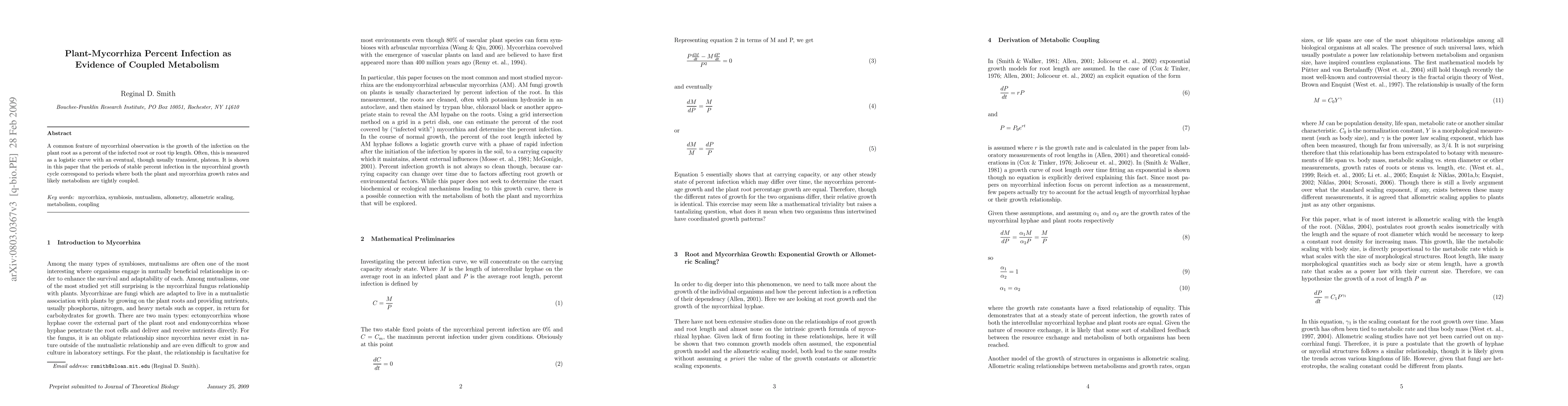 A common feature of mycorrhizal observation is the growth of the infection on the plant root as a percent of the infected root or root tip length. Often, this is measured as a logistic curve with an eventual, though usually transient, plateau. It is shown in this paper that the periods of stable percent infection in the mycorrhizal growth cycle correspond to periods where both the plant and mycorrhiza growth rates and likely metabolism are tightly coupled.