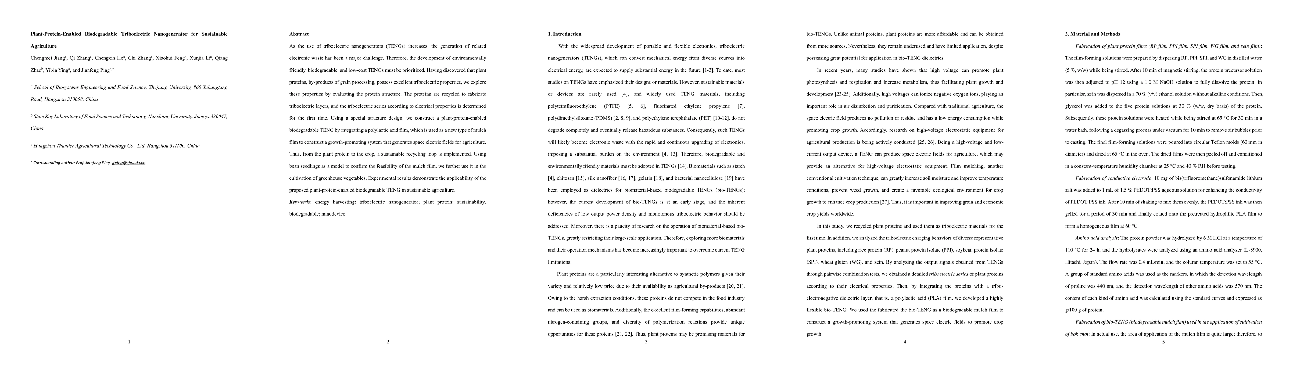 This paper develops a biodegradable triboelectric nanogenerator (TENG) using plant proteins, aiming to reduce electronic waste. The study demonstrates the feasibility of using these proteins to create a sustainable, eco-friendly TENG that can promote crop growth, thus establishing a recycling loop from plant protein to crops.