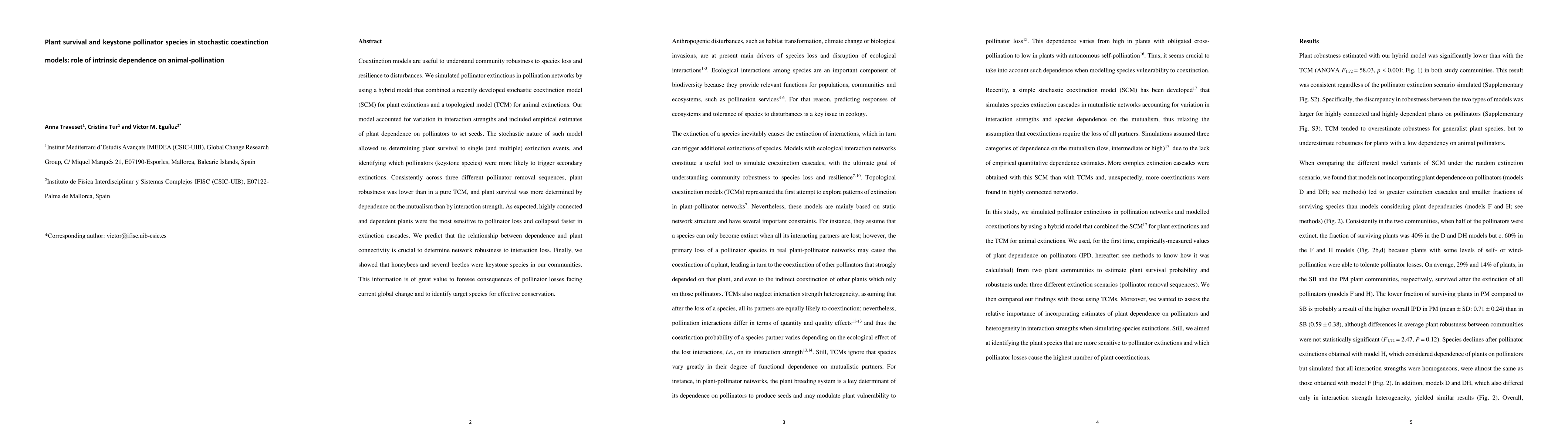 Coextinction models are useful to understand community robustness to species loss and resilience to disturbances. We simulated pollinator extinctions in pollination networks by using a hybrid model that combined a recently developed stochastic coextinction model (SCM) for plant extinctions and a topological model (TCM) for animal extinctions. Our model accounted for variation in interaction strengths and included empirical estimates of plant dependence on pollinators to set seeds. The stochastic nature of such model allowed us determining plant survival to single (and multiple) extinction events, and identifying which pollinators (keystone species) were more likely to trigger secondary extinctions. Consistently across three different pollinator removal sequences, plant robustness was lower than in a pure TCM, and plant survival was more determined by dependence on the mutualism than by interaction strength. As expected, highly connected and dependent plants were the most sensitive to pollinator loss and collapsed faster in extinction cascades. We predict that the relationship between dependence and plant connectivity is crucial to determine network robustness to interaction loss. Finally, we showed that honeybees and several beetles were keystone species in our communities. This information is of great value to foresee consequences of pollinator losses facing current global change and to identify target species for effective conservation.