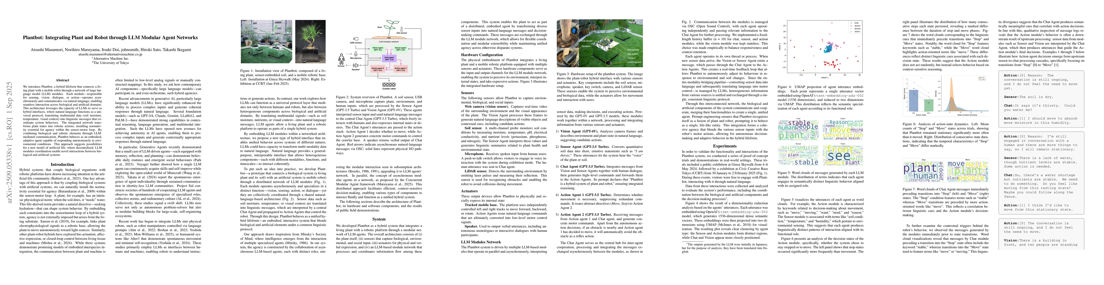 We introduce Plantbot, a hybrid lifeform that connects a living plant with a mobile robot through a network of large language model (LLM) modules. Each module - responsible for sensing, vision, dialogue, or action - operates asynchronously and communicates via natural language, enabling seamless interaction across biological and artificial domains. This architecture leverages the capacity of LLMs to serve as hybrid interfaces, where natural language functions as a universal protocol, translating multimodal data (soil moisture, temperature, visual context) into linguistic messages that coordinate system behaviors. The integrated network transforms plant states into robotic actions, installing normativity essential for agency within the sensor-motor loop. By combining biological and robotic elements through LLM-mediated communication, Plantbot behaves as an embodied, adaptive agent capable of responding autonomously to environmental conditions. This approach suggests possibilities for a new model of artificial life, where decentralized, LLM modules coordination enable novel interactions between biological and artificial systems.