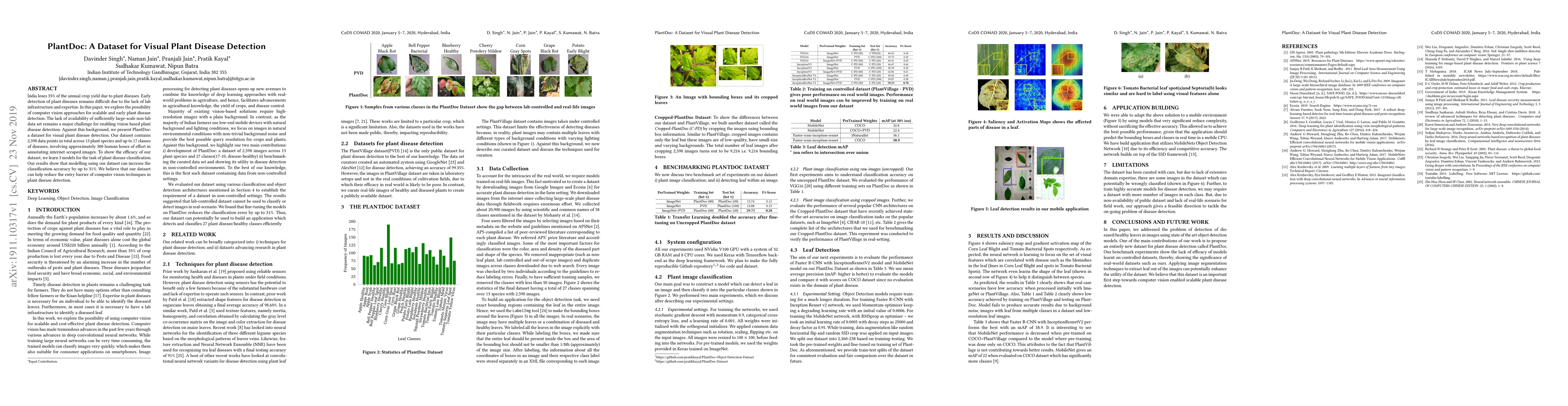 The paper introduces PlantDoc, a dataset for visual plant disease detection, aiming to address India's crop yield loss due to plant diseases. The dataset comprises 2,598 images across 13 plant species and 17 disease classes, and demonstrates a 31% increase in classification accuracy using the data.