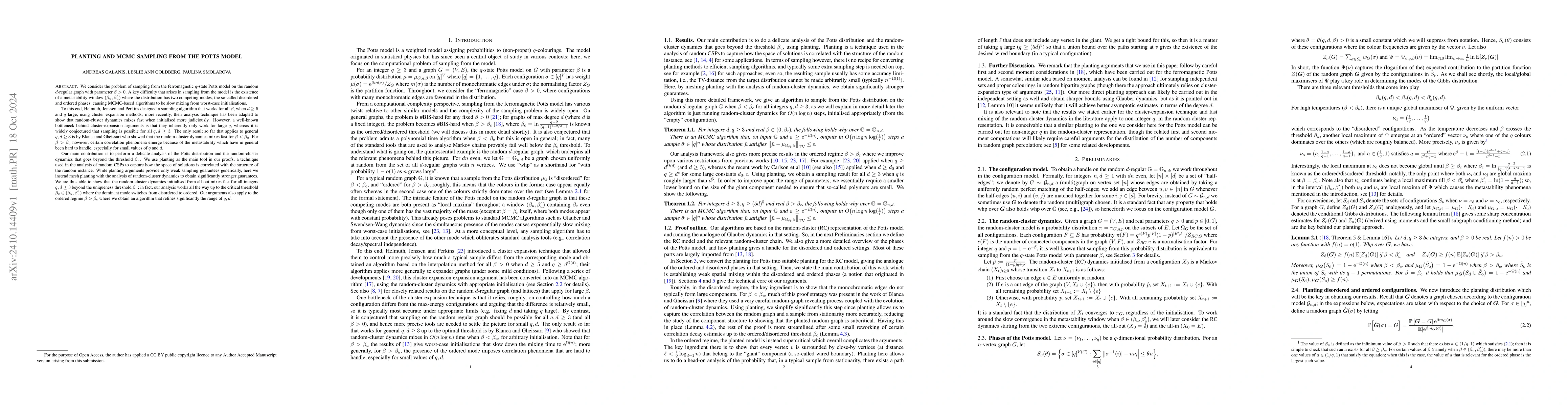 The main technical contribution lies in the innovative use of planting techniques combined with random-cluster dynamics analysis, enabling a comprehensive study of the Potts model's sampling problem beyond the uniqueness threshold.