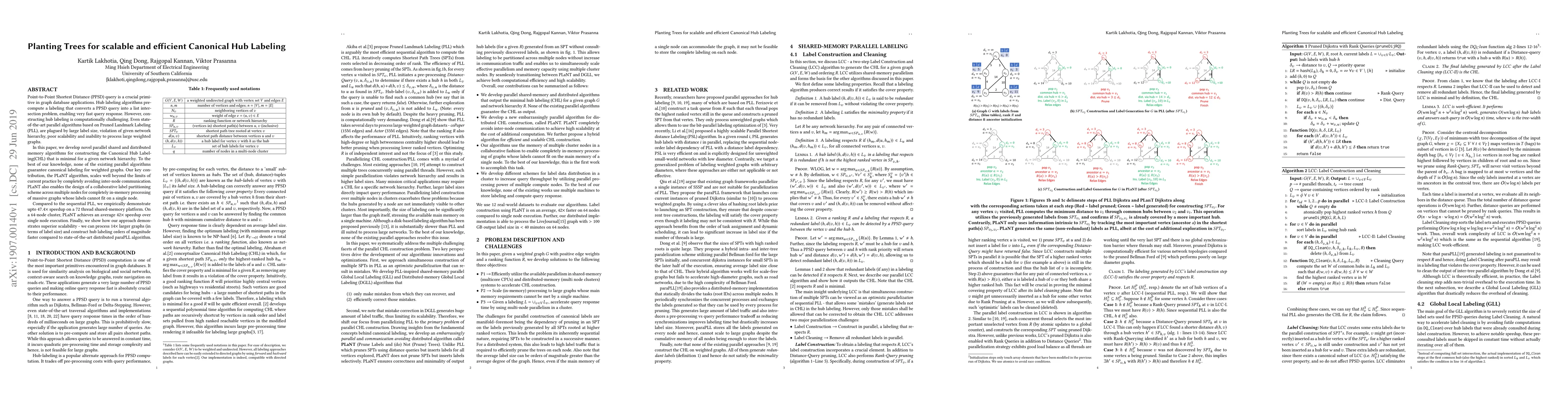 This paper introduces novel parallel algorithms for constructing minimal Canonical Hub Labeling (CHL) to efficiently handle Point-to-Point Shortest Distance queries in graph databases. The PLaNT algorithm achieves significant speedups and scalability, demonstrating up to 47.4x improvement on multi-thread systems and 42x on a cluster, while processing larger graphs than existing methods.
