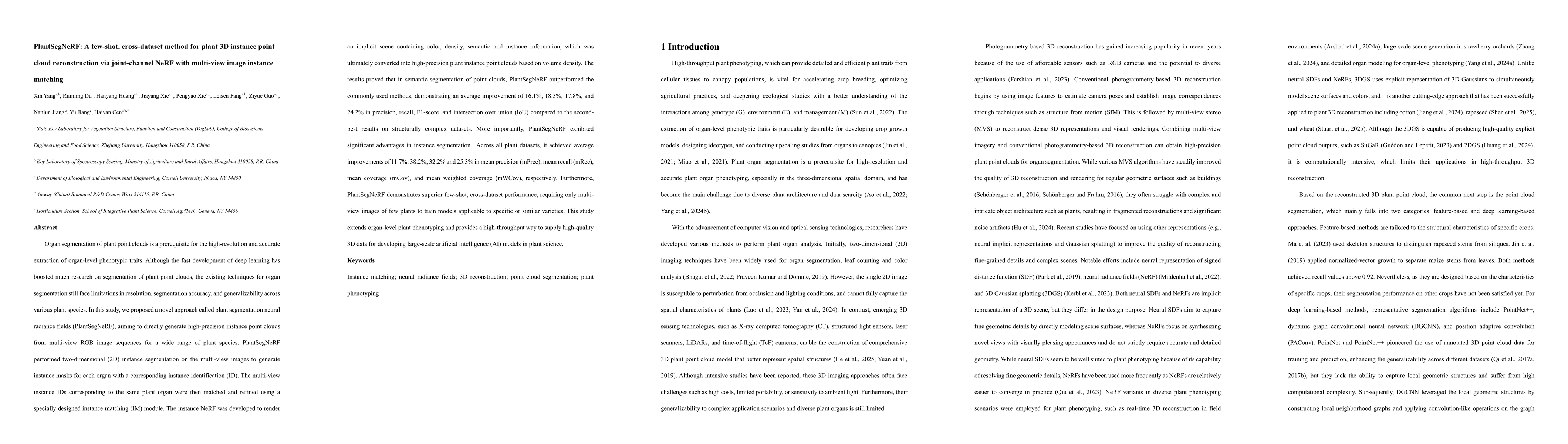 Organ segmentation of plant point clouds is a prerequisite for the high-resolution and accurate extraction of organ-level phenotypic traits. Although the fast development of deep learning has boosted much research on segmentation of plant point clouds, the existing techniques for organ segmentation still face limitations in resolution, segmentation accuracy, and generalizability across various plant species. In this study, we proposed a novel approach called plant segmentation neural radiance fields (PlantSegNeRF), aiming to directly generate high-precision instance point clouds from multi-view RGB image sequences for a wide range of plant species. PlantSegNeRF performed 2D instance segmentation on the multi-view images to generate instance masks for each organ with a corresponding ID. The multi-view instance IDs corresponding to the same plant organ were then matched and refined using a specially designed instance matching module. The instance NeRF was developed to render an implicit scene, containing color, density, semantic and instance information. The implicit scene was ultimately converted into high-precision plant instance point clouds based on the volume density. The results proved that in semantic segmentation of point clouds, PlantSegNeRF outperformed the commonly used methods, demonstrating an average improvement of 16.1%, 18.3%, 17.8%, and 24.2% in precision, recall, F1-score, and IoU compared to the second-best results on structurally complex datasets. More importantly, PlantSegNeRF exhibited significant advantages in plant point cloud instance segmentation tasks. Across all plant datasets, it achieved average improvements of 11.7%, 38.2%, 32.2% and 25.3% in mPrec, mRec, mCov, mWCov, respectively. This study extends the organ-level plant phenotyping and provides a high-throughput way to supply high-quality 3D data for the development of large-scale models in plant science.