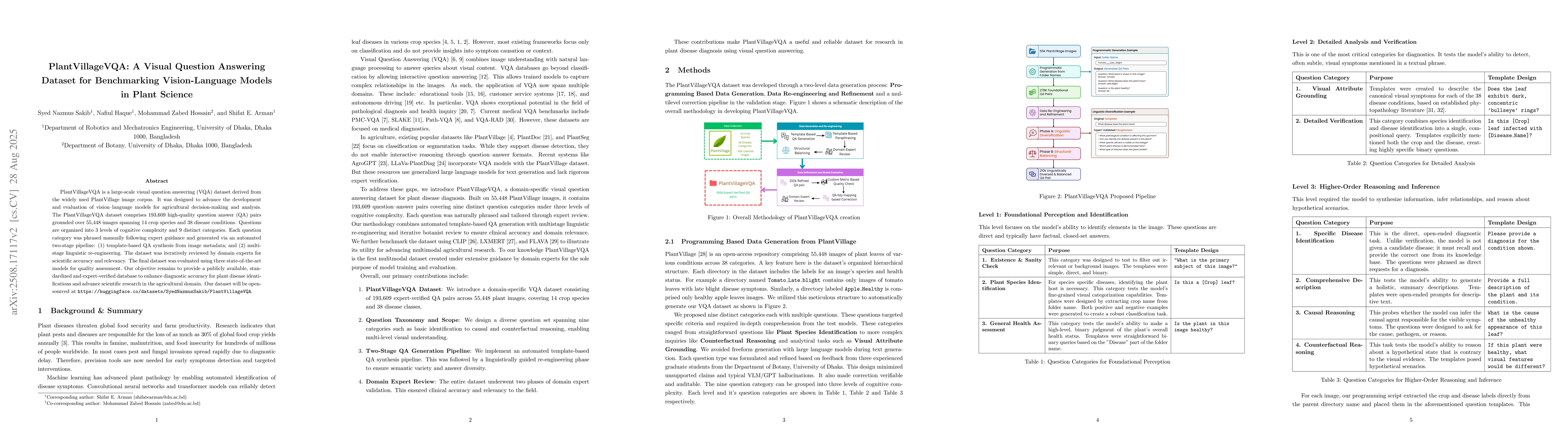 PlantVillageVQA is a large-scale visual question answering (VQA) dataset derived from the widely used PlantVillage image corpus. It was designed to advance the development and evaluation of vision-language models for agricultural decision-making and analysis. The PlantVillageVQA dataset comprises 193,609 high-quality question-answer (QA) pairs grounded over 55,448 images spanning 14 crop species and 38 disease conditions. Questions are organised into 3 levels of cognitive complexity and 9 distinct categories. Each question category was phrased manually following expert guidance and generated via an automated two-stage pipeline: (1) template-based QA synthesis from image metadata and (2) multi-stage linguistic re-engineering. The dataset was iteratively reviewed by domain experts for scientific accuracy and relevancy. The final dataset was evaluated using three state-of-the-art models for quality assessment. Our objective remains to provide a publicly available, standardised and expert-verified database to enhance diagnostic accuracy for plant disease identifications and advance scientific research in the agricultural domain. Our dataset will be open-sourced at https://huggingface.co/datasets/SyedNazmusSakib/PlantVillageVQA.